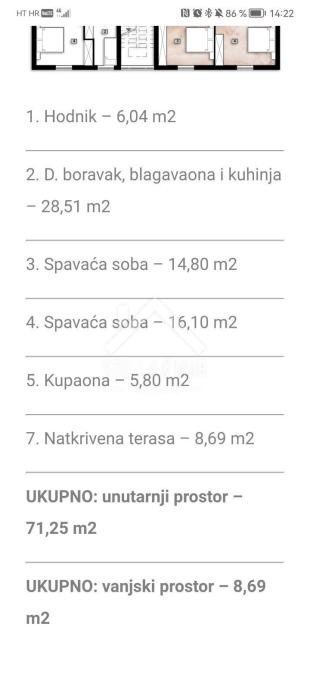 Sastoji se od hodnika, sobe, sobe, kupaone, loggie, natkrivene terase, dnevnog boravka sa kuhinjom i blagovaonom, kome pripada dio i okućnice.