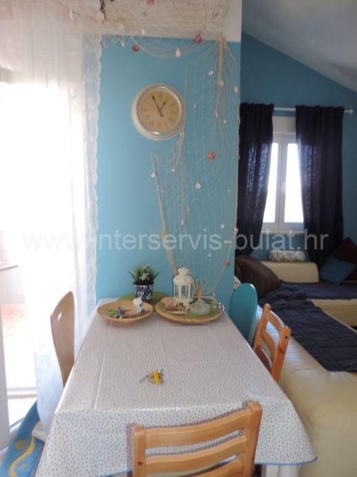 Stanu pripada spremište u podrumu zgrade od 11m2 i parkirno mjesto. Stan je opremljen i useljiv. Do mora oko 800m.