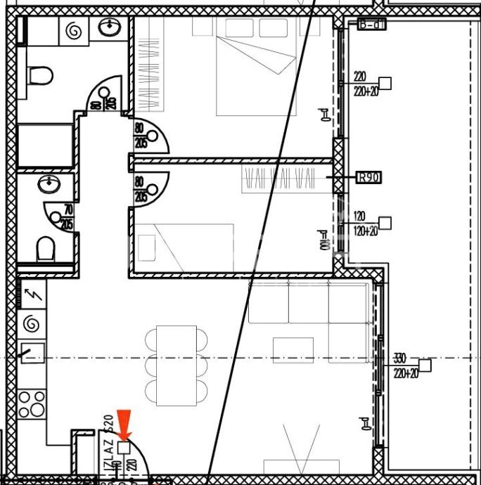 Stan S20 se nalazi na 1. katu zgrade s ukupno 28 jedinica, stambene površine 79,64m2 i ukupne obračunske površine 74,51m2. Sastoji se od: hodnika, kuhinje+blagavaonica+dnevni boravak, 2 spavaće sobe, kupaonice, zasebnog wc-a i prostrane lođe od 20,53m2 (koef. 0,75=15,40m2).
