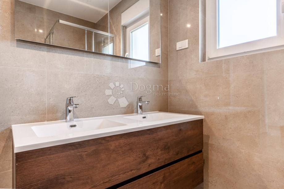 Prvi kat je u naravi stan od 118 m² i nudi raskošan prostor za život: tri spavaće sobe, prostrani dnevni boravak, dvije potpuno opremljene kupaonice, plus dodatni WC. Svaki detalj adaptacije izveden je vrhunski koristeći moderne materijale a funkcionalna izvedba i kvalitetna završna obrada stvaraju atmosferu u kojoj je lako zamisliti svakodnevicu.