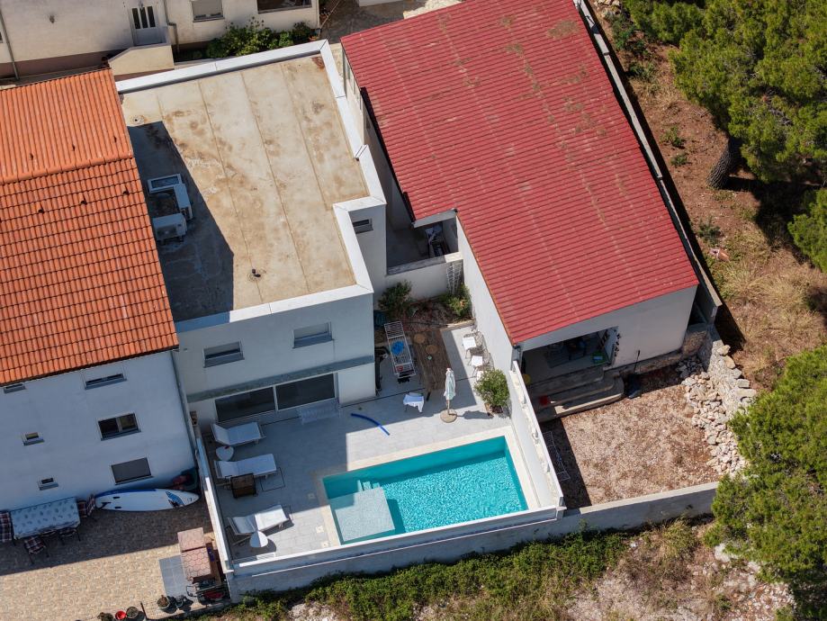 Ukupna površina iznosi 569m2 stambenih objekata, a površina zemljišta od 1065m2. Nekretnina se ističe izuzetnom lokacijom u prvom redu do mora, pružajući prekrasan pogled na more i okolicu, te obilje prirodnog svjetla zahvaljujući južnoj i istočnoj orijentaciji.