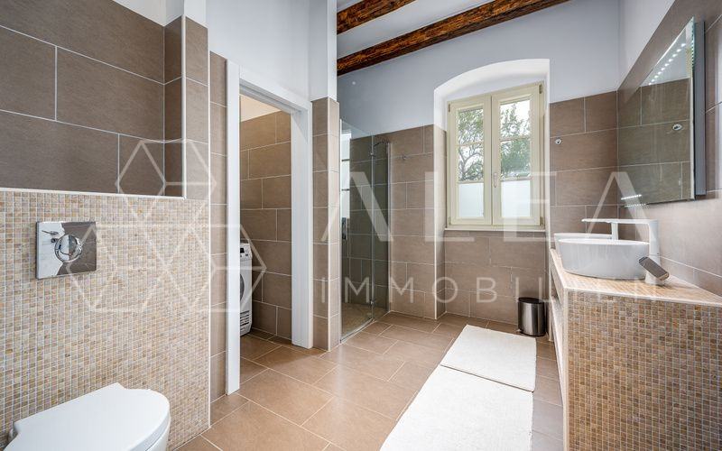 Kuća impresionira ne samo svojim očaravajućim vrtom, već i prostranom terasom od 200 četvornih metara, koja se proteže neposredno ispred kuće. Ovdje vas očekuje bazen od 32 m2, opremljen najnovijom bazenskom tehnologijom. Bazen se puni kišnicom i testira se dva puta tjedno na najveću kvalitetu vode.