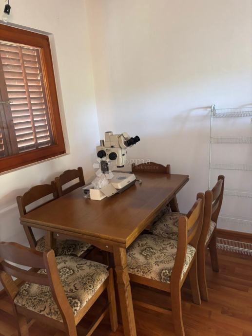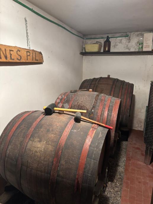 U donjem dijelu kuće nalazi se hodnik s gostinjskim WC-om, zatim manja, ali potpuno funkcionalna kuhinja s blagovaonskim stolom, koja je idealna za druženja s obitelji ili prijateljima. Odmah uz kuhinju smješten je pravi mali vinski podrum s velikim drvenim bačvama – savršeno mjesto za vlastitu proizvodnju vina ili jednostavno za pohranu domaćih proizvoda.