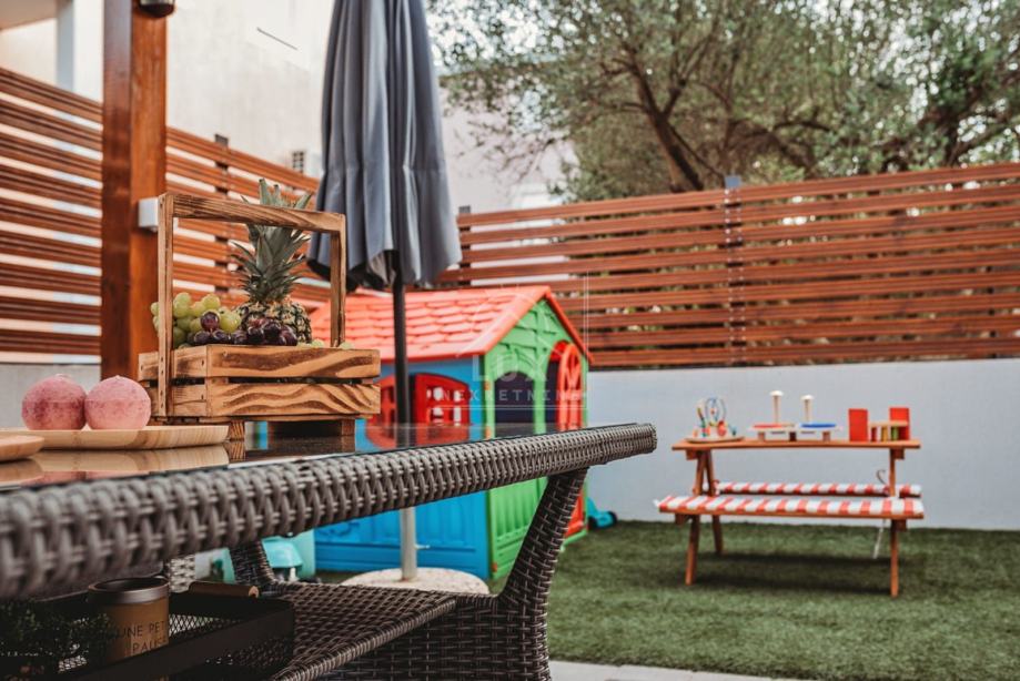 Stanu, također, pripada i ograđeno dvorište pov. 61.09 m2 koje je dijelom popločano i dijelom sa postavljenom umjetnom travom, te s pergolom. U dvorištu se nalazi i ostava i roštilj.