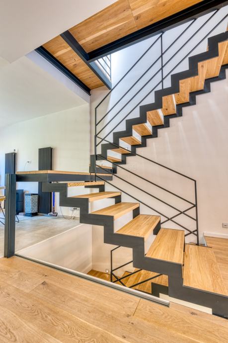Prvi stan se prostire na četiri etaže s ukupnom zatvorenom površinom od 190,47 m² koje su povezane predivnim unutarnjim stepenicama. Prva etaža, u razini suterena se sastoji od kupaonice, praonice rublja, spreme te otvorenog prostora koji se može opremiti kao teretana, ured i sl. Druga etaža, visoko prizemlje se sastoji od prostranog hodnika i radne sobe. Na trećoj etaži; prvom katu nalazi se dnevni, open space, dio stana; prostrana, potpuno opremljena kuhinja, blagavaonica, dnevni boravak, toalet i prekrasna terasa sa vrtom, Na drugom katu su smještene dvije spavaće sobe sa en suite kupaonicama i pripadajućim balkonima te hodnik.