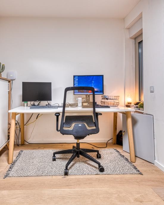 První byt se rozkládá na čtyřech úrovních s celkovou uzavřenou plochou 190,47 m², které jsou propojeny krásným vnitřním schodištěm. První úroveň, na úrovni suterénu, se skládá z koupelny, prádelny, skladu a otevřeného prostoru, který lze zařídit jako posilovnu, kancelář atd. Druhá úroveň, zvýšené přízemí, se skládá z prostorné chodby a pracovny. Na třetí úrovni, prvním patře, se nachází otevřený obytný prostor bytu; prostorná, plně vybavená kuchyně, jídelna, obývací pokoj, toaleta a krásná terasa se zahradou. V druhém patře se nacházejí dvě ložnice s vlastními koupelnami a přilehlými balkony, a také chodba.