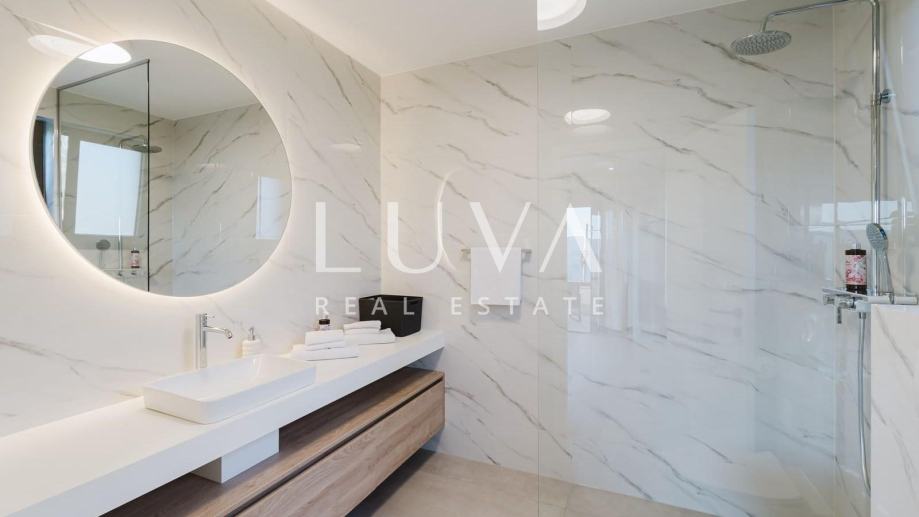 • Stambeni prostor: 180,8 m² unutarnjeg prostora s dodatkom dvije terase (37,1 m² natkrivene + 35,5 m² nenatkrivene), balkona (12,8 m²), sunčališta (27,1 m²) i strojarnice za bazen (4 m²).