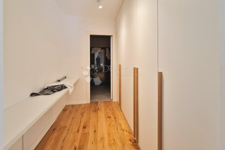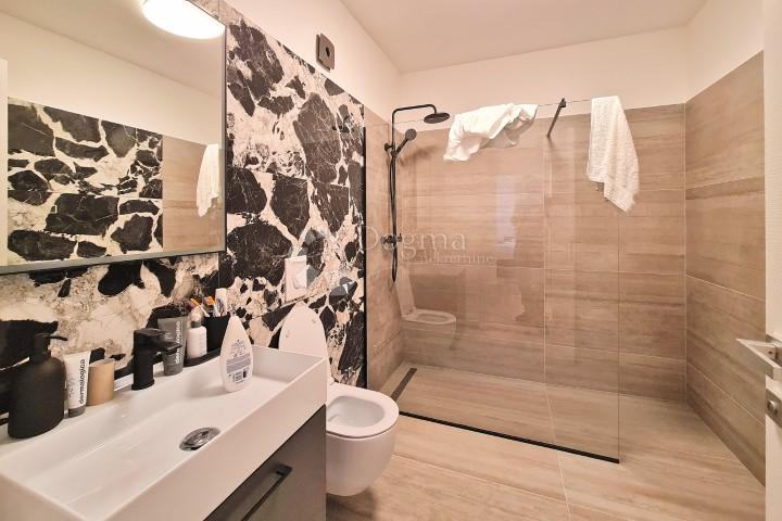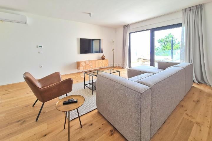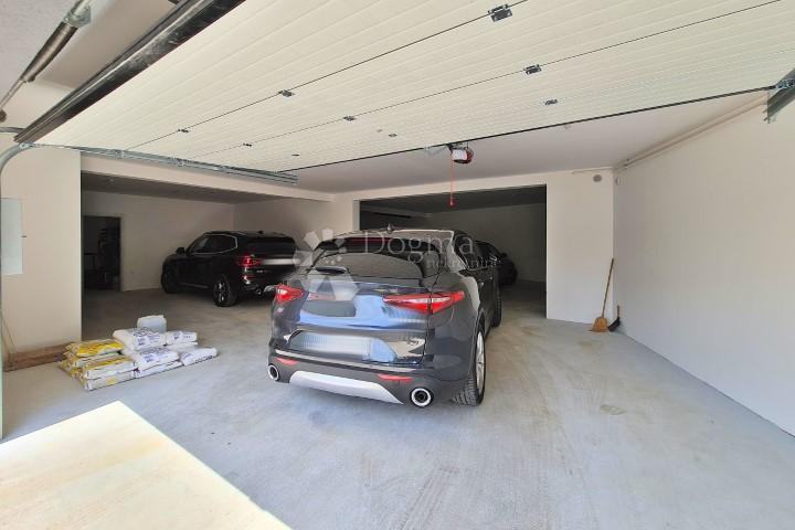 U suterenu se nalazi garaža za 2-3 vozila, vešeraj, unutarnjim stubištem dolazi se do prizemnog dijela stana gdje je smješten dnevni dio stana koji se sastoji od kuhinje sa blagovaonom , veliki dnevni boravak te wc. Iz prizemlja postoji mogućnost izlaza na okućnicu na kojoj je bazen i sunčalište.