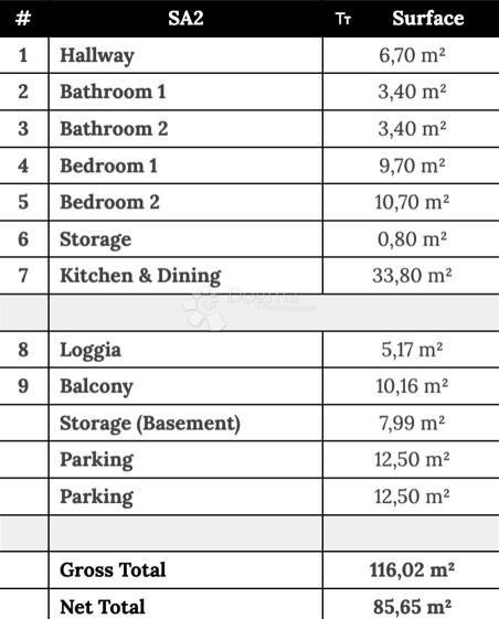 Ukupna bruto površina stana iznosi 116,02 m². Zgrada je već izgrađena, a u tijeku su završni radovi, što znači da ćete vrlo brzo moći uživati u vlastitom domu na samo nekoliko koraka od mora.