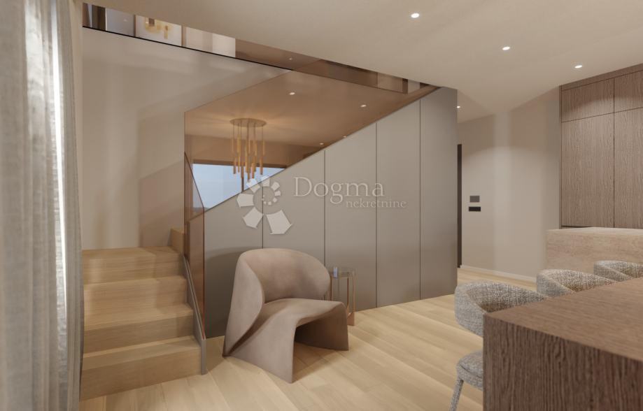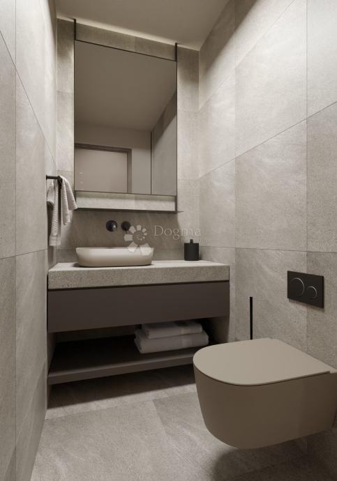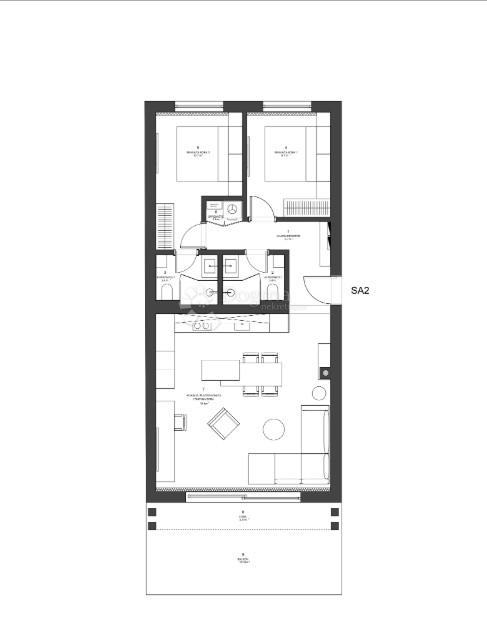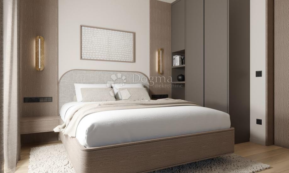 Stan je organiziran tako da u svakodnevicu unosi lakoću i svjetlost. Veliki dnevni boravak s kuhinjom i blagovaonicom (33,80 m²) srce je doma, otvoren prema lođi i balkonu, pa je granica između unutarnjeg i vanjskog prostora fluidna i prirodna. Dvije spavaće sobe (9,70 m² i 10,70 m²) nude mir i privatnost, dok dva moderna kupaonice osiguravaju funkcionalnost i udobnost. Tu je i mali spremnik unutar stana, a dodatno i spremište u podrumu (7,99 m²) – praktičnost koju ne treba zanemariti.