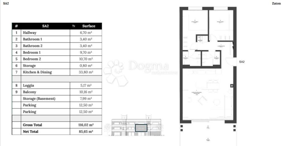 U Zatonu, samo 170 metara od mora, smjestila se nova moderna zgrada koja spaja čistu arhitekturu s mirnim šarmom dalmatinske obale. U njoj se nalazi osam pažljivo osmišljenih rezidencija, a među njima i ovaj stan – SA2 – neto površine 85,65 m².