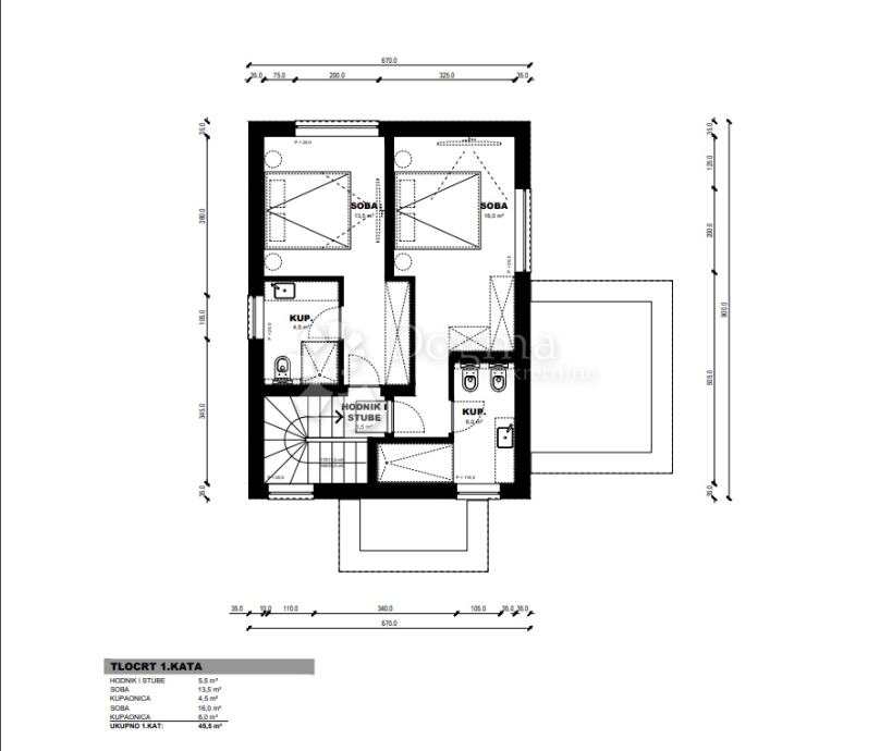 Neto površina prizemlja iznosi 61 m² dok je neto kvadratura 1. kata 45 m².