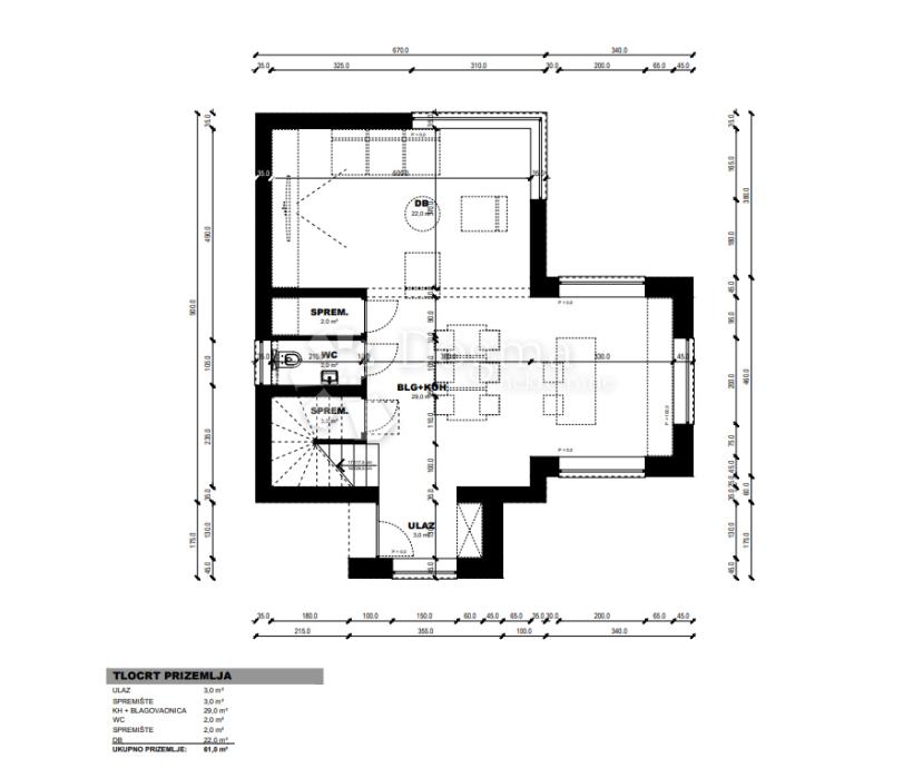 Prizemlje je zamišljeno kao glavni dio kuće gdje ćete provoditi većinu vremena, a sastoji se od ulaznog hodnika, prdostranog dnevnog boravka, kuhinje i blagovaonice, gostinjskog wc-a te 2 ostave.