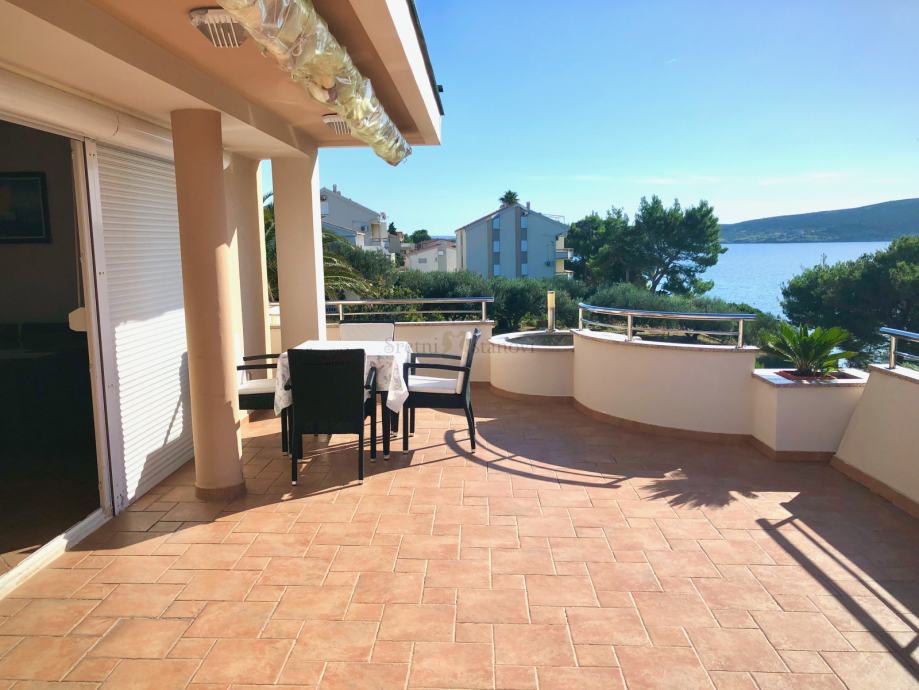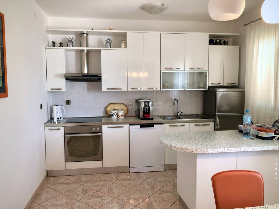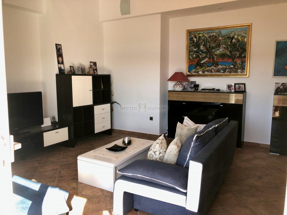 Prvi apartman na katu ima oko 90m2 i sastoji se od ulaznog hodnika, dnevnog boravka, kuhinje i blagovaone, kupaone i velike terase.