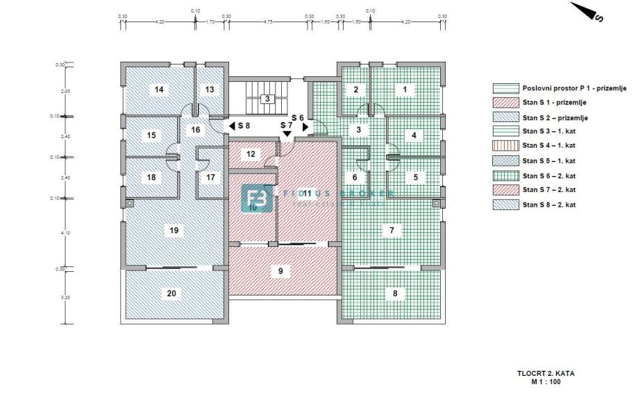 Stan S2 ukupne korisne površine 104,65 m2 (stambena površina 68,66 m2 + terasa 19,80 m2 + vrt 164,42 + parking 25 m2) nalazi se u prizemlju. Sastoji se od ulaznog dijela, tri spavaće sobe, dvije kupaonice, kuhinje s blagovaonicom, dnevni boravak s izlazom na terasu površine 19,80 m2 i vrt površine 161,42 m2. Stanu pripadaju dva parking mjesta oznake P9 i P10. Cijena iznosi 315.000 € (PDV uključen - kupac je oslobođen plaćanja 3% poreza na promet nekretninama).