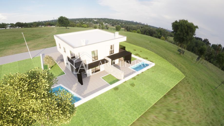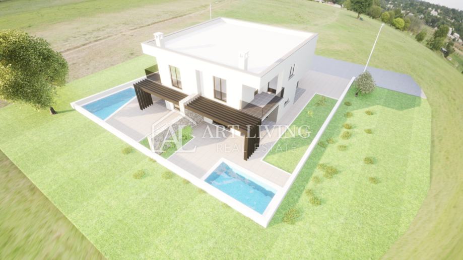 Prodaje se dvojna vila s bazenom u novogradnji moderne arhitekture, udaljena 3 500 m od centra grada Umaga i mora sa pogledom na okolicu i pejzaž.