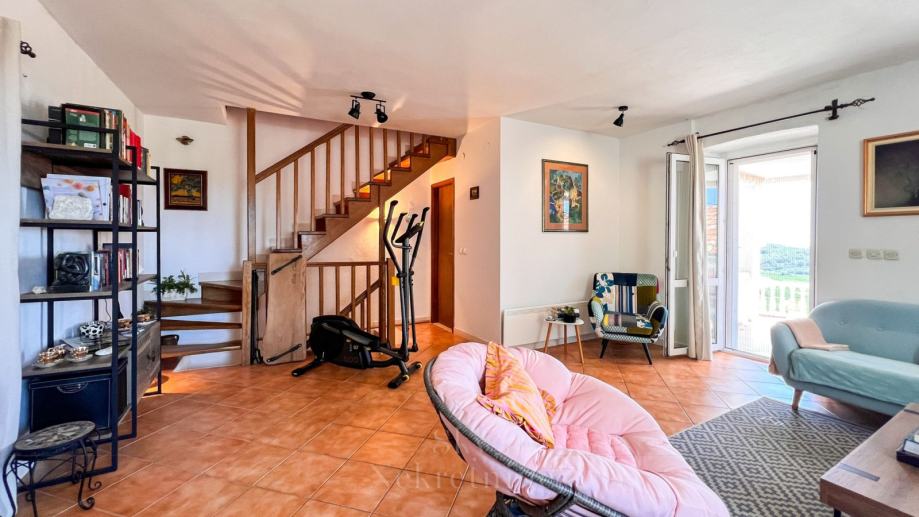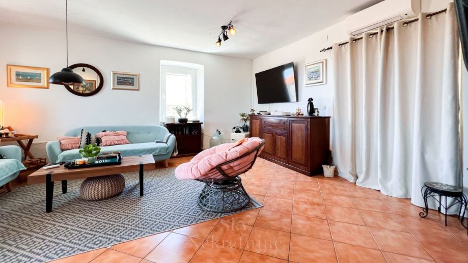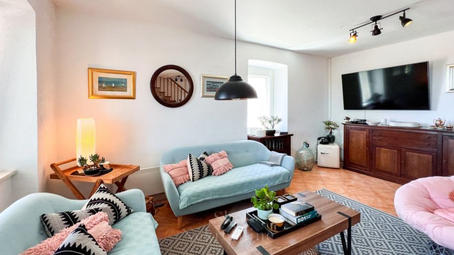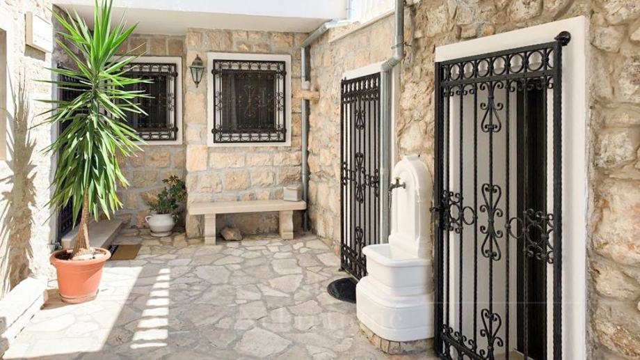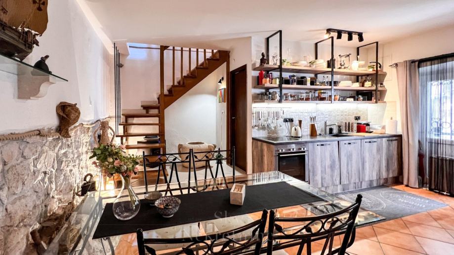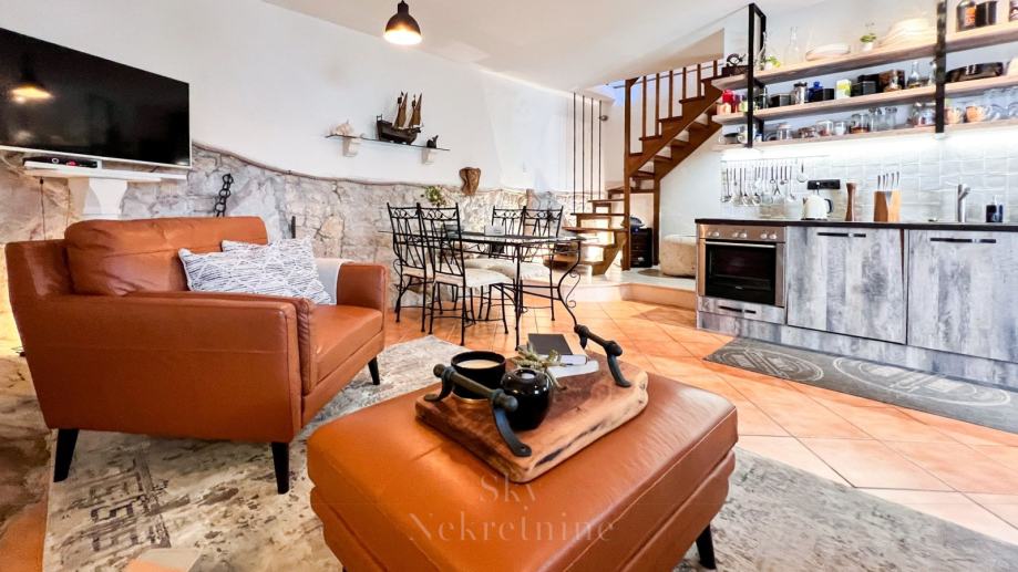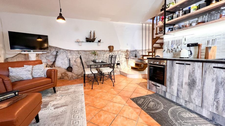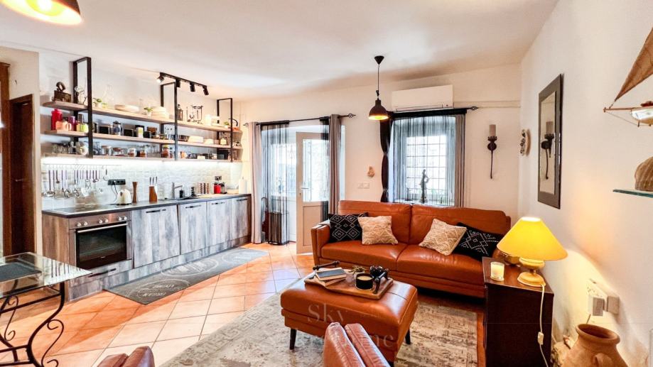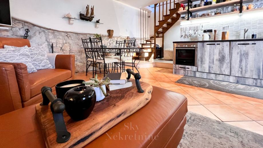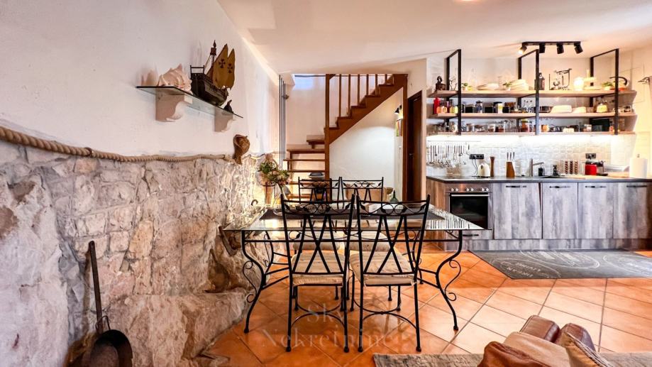 Unutrašnjost kuće odiše autentičnim mediteranskim šarmom. Pri uređenju je poseban naglasak stavljen na prirodne materijale, osobito kamen, koji se, kao središnji dekorativni element, savršeno uklapa u prostor i stvara toplu, tradicionalnu atmosferu.