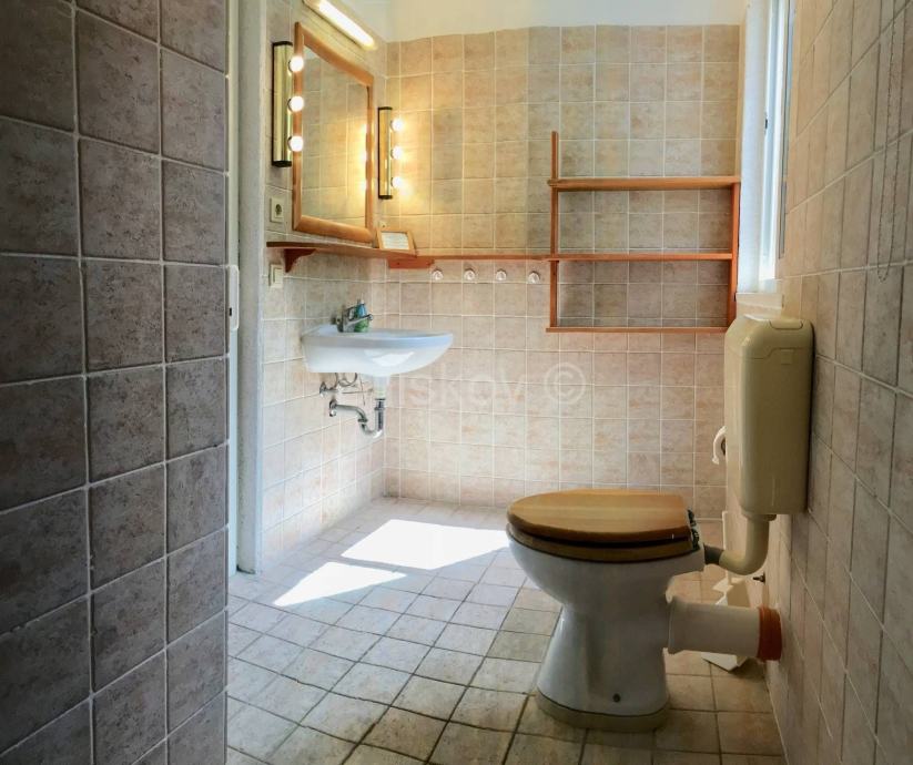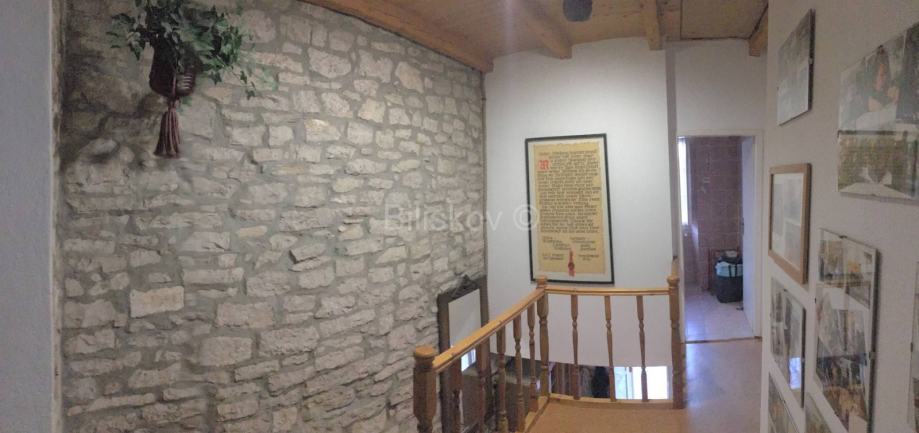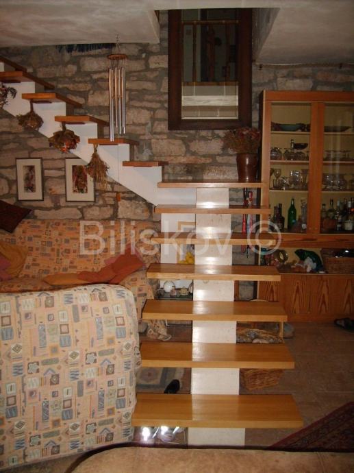 Kuća 1 je dvojna kuća i površine je 140m2. U prizemlju je kuhinja s dnevnim boravkom i wc, a na katu su 3 sobe i dvije kupaonice. Renovirana je 1998.