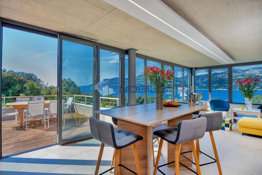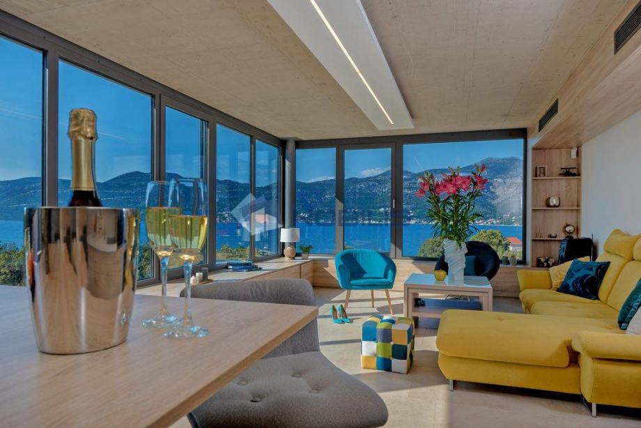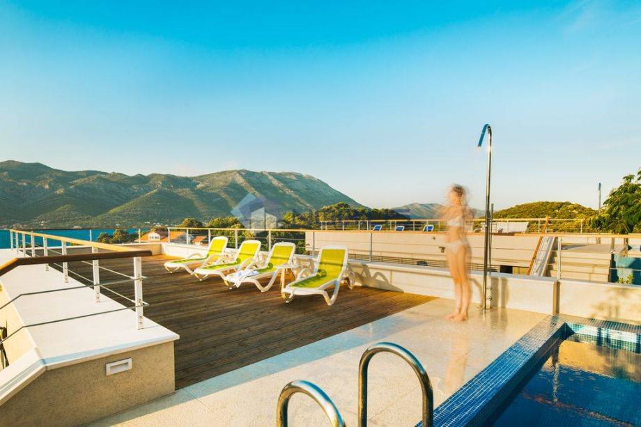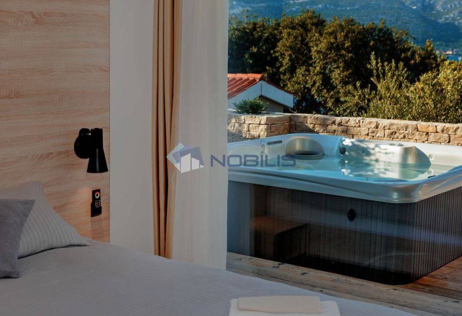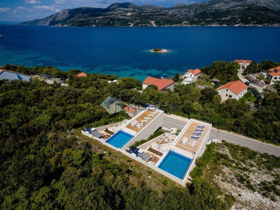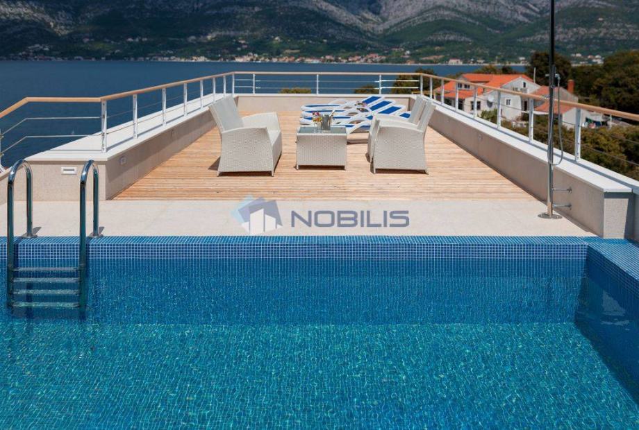 Korčula - luksuzna villa - novoizgrađena vila ima krovni bazen s grijanom morskom vodom na otoku Korčuli, saunu, teretanu i jacuzzi te prekrasni otvoreni pogled na more i i Pelješac, udaljena je samo 50 m od mora. Mjesto s kojeg se pruža pogled na zalazak sunca. Vila je sagrađena po svim pravilima struke sa najboljim i najkvalitetninjim materijalima koji su danas na tržištu. Vilu je gradila švedsko-hrvatska firma sa dugogodišnjim stažom u te dvije države.