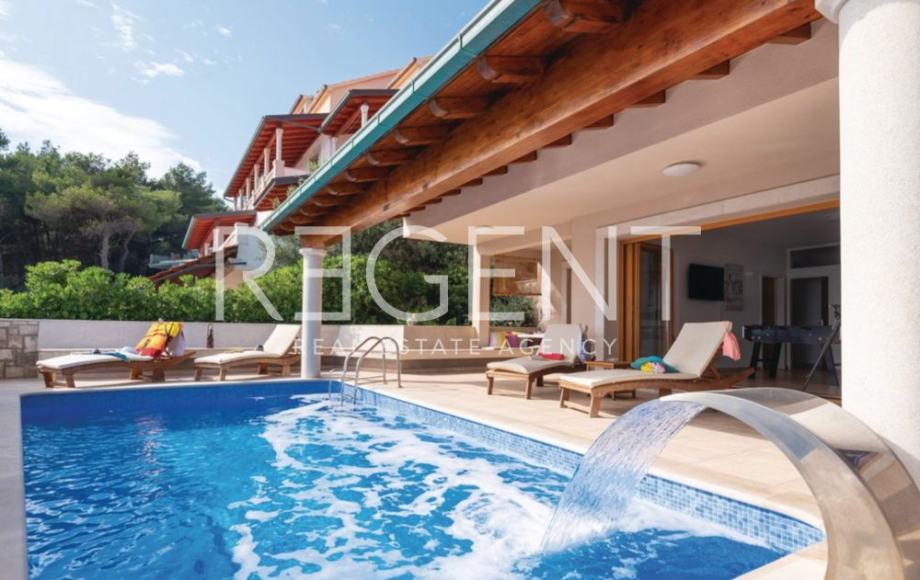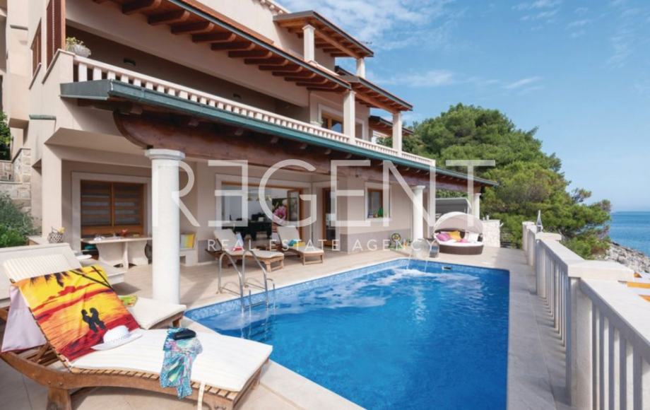 Predstavljamo vam predivnu vilu smještenu tik uz more.Vila se nalazi na parceli od _____ ima ukupnu površinu od m2 te dvorište površine … m2. Sadrži prizemlje 1. i 2. kat.U prizemlju vile nalazi se prostorija s jacuzzijem iz koje se ulazi u prostoriju sa finskom saunom i fitness opremom. Iz svake prostorije je otvoren pogled na more. U prizemlju je i prostorija za igru s biljarskim stolom, stolnim nogometom, te dva računala. Prizemlje ima izlaz na bazen površine ___ uz kojeg je sunčalište.Unutarnje stepenice vode na 1. kat, gdje se nalazi prostrana kuhinja, blagovaonica i dnevni boravak, s izravnim izlazom na natkrivenu terasu s stolom i roštiljem. Ovdje možete uživati u večernjim satima s obitelji i prijateljima. Na istom katu nalaze se dvije spavaće sobe sa zasebnim kupaonicama. Jedna soba ima izlaz na balkon.Na 2. katu nalaze se još 3 luksuzne spavaće sobe, svaka sa svojom kupaonicom i balkonom s pogledom na more.Vila ima uhodan biznis, radi deset godina.Smještena je izravno uz more, pa možete doći i brodom, a ispod kuće se nalazi vez za brod.Nekoliko stepenica vodi od mora do prekrasne kamene terase s suncobranima i ležaljkama, s koje se pruža panoramski pogled na jedan od najljepših arhipelaga Jadrana.Ukupno, ova kuća ima potencijal za pružanje visokokvalitetnog smještaja tijekom cijele godine, a posebno u ljetnoj sezoni s mogućnošću privlačenja raznolike klijentele. Također, kuća već ima uhodani posao te je bookirana svake sezone. U široj okolici su slikoviti otočići, duboke uvale, strmo odsječene hridi i plodne pitome zaravni, što ovaj kraj čini mjestom pogodnim za život i za neograničene mogućnosti odmora.Za više informacija, kontaktirajte našeg agenta na brojeve telefona: