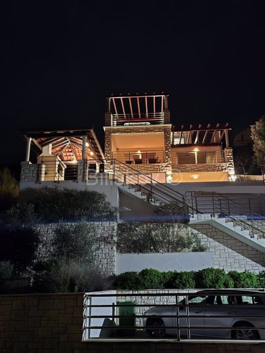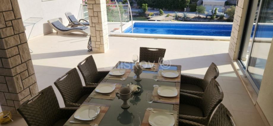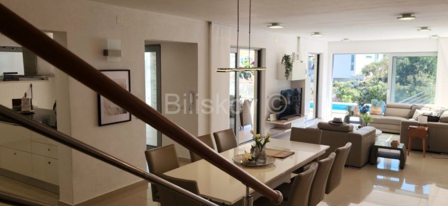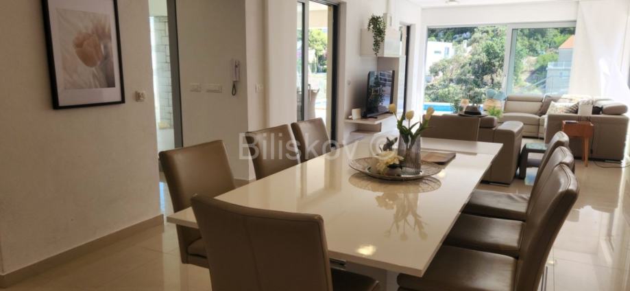 U prizemlju površine 110m2 nalazi se moderna, kompletno opremljena kuhinja s blagovaonicom i dnevnim boravkom iz kojeg se izlazi na dijelom natkrivenu terasu s bazenom od 19m2, roštiljem i prostorom za blagovanje. Velike staklene stjenke omogućuju otvoren pogled na more.