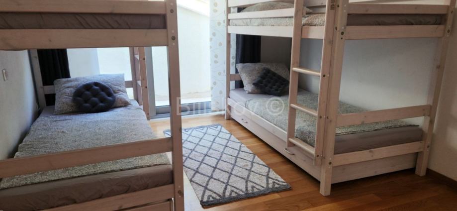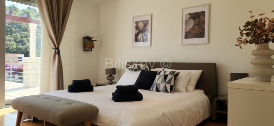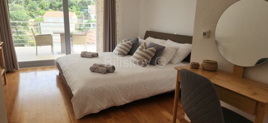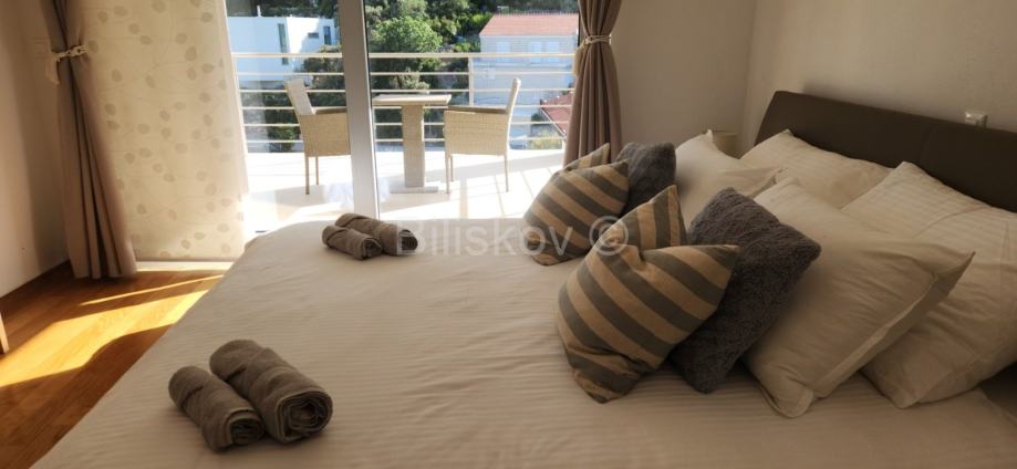 Na prvom katu su 3 spavaće sobe s kupaonicama, a dvije imaju i garderobu. Svaka soba ima balkon sa pogledom na more.