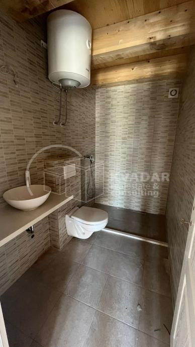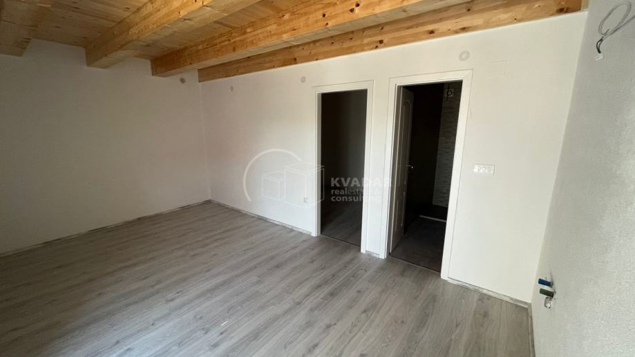 Na prvom katu je stan od 77 m2 koji sadrži 2 spavaće sobe,.boravak sa trpezarijom i kuhinjskom nisom, te kupatilo sa toaletom. Stan je povezan stepenicama sa potkrovljem površine 30m2 i visine 2,20m u najvišem dijelu. Ovom stanu pripada i vanjski vrt od 25m2.