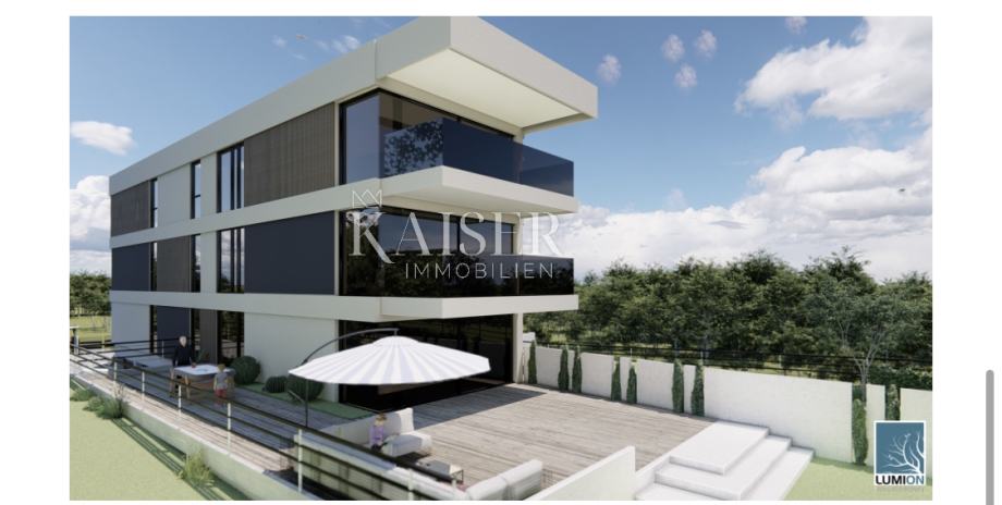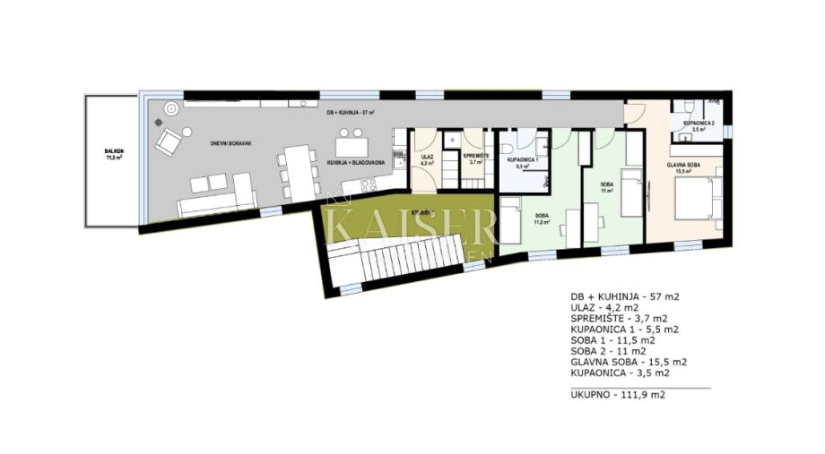 Kaiser Immobilien predstavlja stan u prizemlju novogradnje u Kostreni. Stan je površine 112 m2 gdje imamo dvije spavaće sobe od 11,5 m2 i jednu master spavaću sobu od 15,5 m2, dvije kupaonice te prostrani dnevni boravak s kuhinjom i blagavaonom. U podrumu se nalazi spremište te jedno parkirno mjesto u garaži i jedno ispred zgrade. Ovaj stan se nalazi u prizemlju te ima svoju okućnicu.
