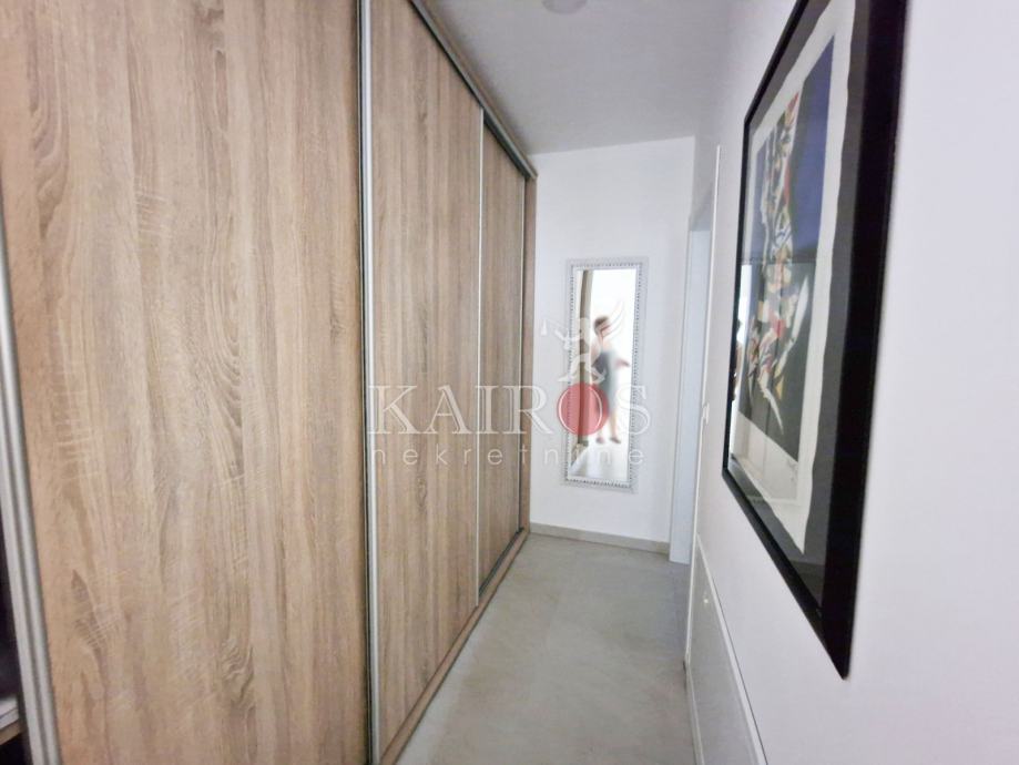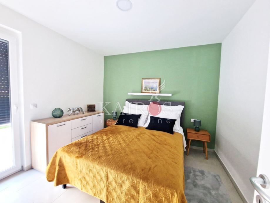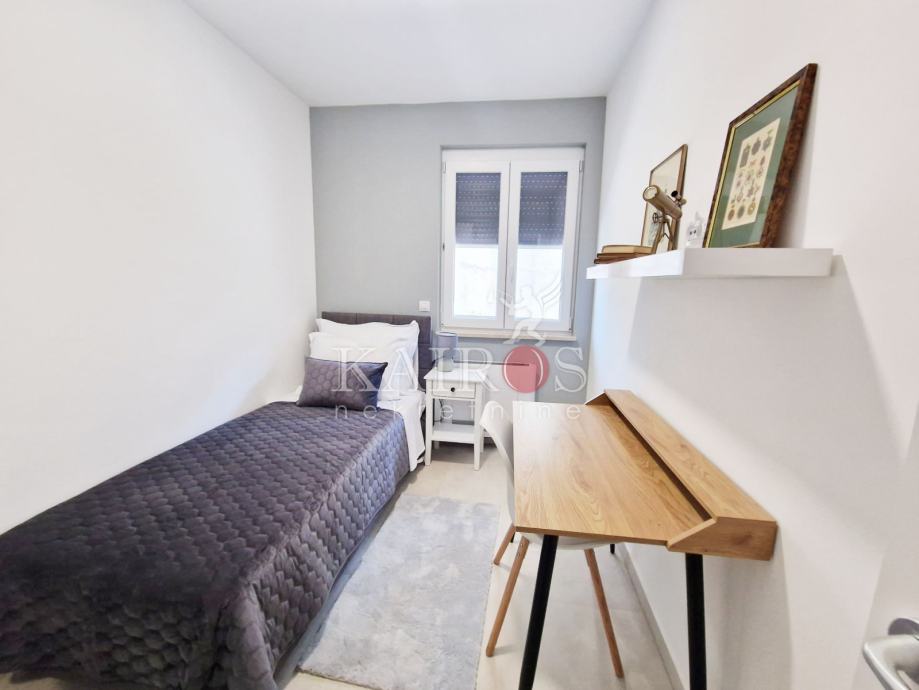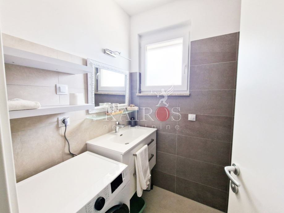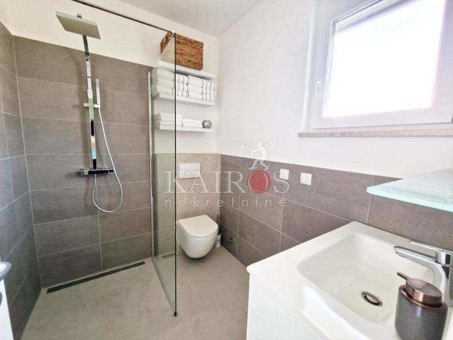 KOSTRENA, iznajmljujemo stan površine 100 m2, trosoban s dnevnim boravkom i balkonom. Stan se nalazi u manjoj zgradi (novogradnja). Grijanje/hlađenje - dizalica topline i podno grijanje. Veća spavaća soba s vlastitom kupaonicom i još jedna kupaonica.