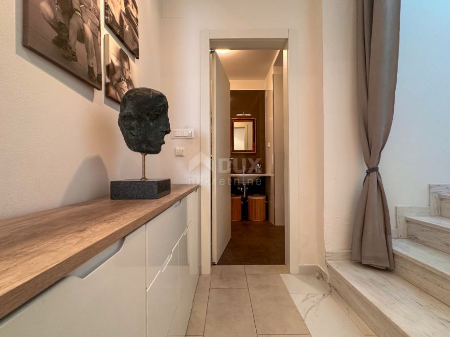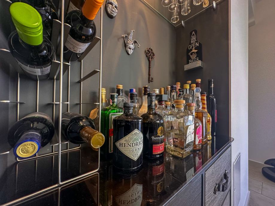 Posebna prednost ovog stana je velika okućnica koja pruža pravi doživljaj luksuza. Natkrivena terasa idealna je za uživanje u toplim ljetnim večerima, dok sunčalište i travnjak nude prostor za opuštanje na suncu. Bazen u dvorištu pruža savršeno osvježenje, a iz gotovo svih dijelova stana, uključujući okućnicu, pruža se spektakularan pogled na more i okolinu, čime se osigurava doživljaj života uz obalu.
