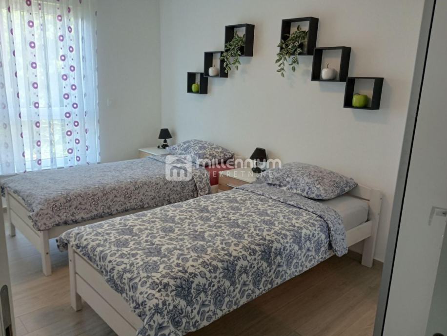 Stan je moderno uređen i prostran, a sastoji se od ulaznog hodnika, garderobe, degažmana, odvojenog toaleta, kupaonice, dvije udobne spavaće sobe, kuhinje, blagovaonice i dnevnog boravka te pripadajuće terase koja poziva na uživanje u miru i pogledu. Dodatna pogodnost stana su podno grijanje i klima uređaj koji osiguravaju ugodnu temperaturu tijekom cijele godine.