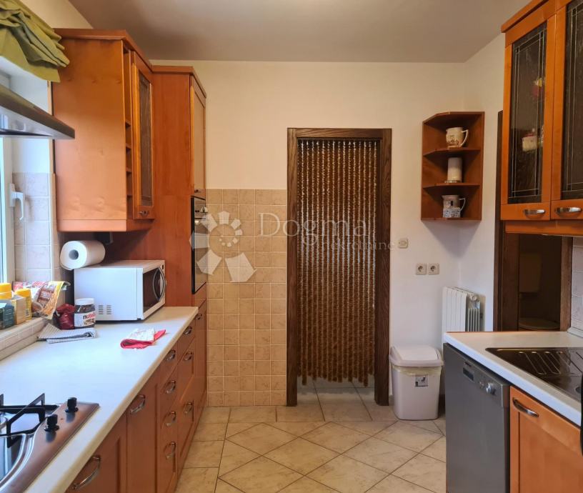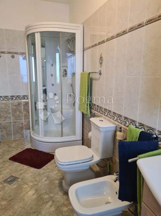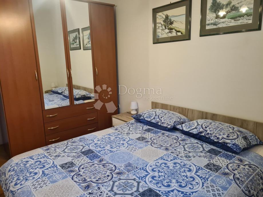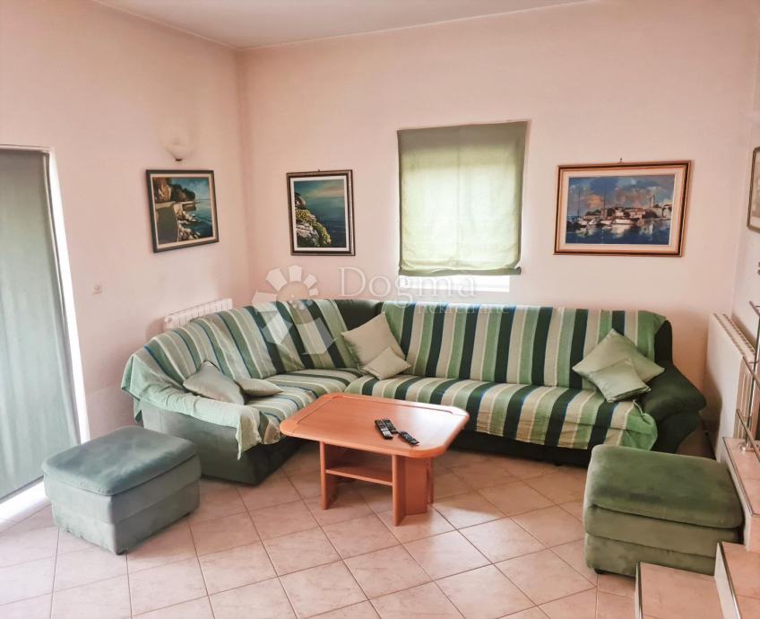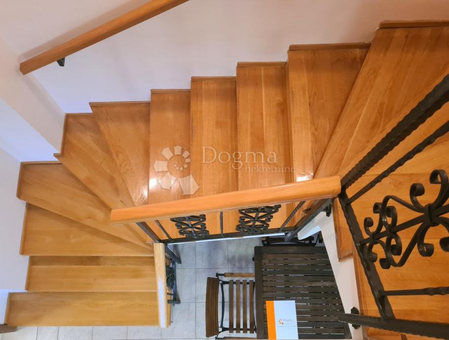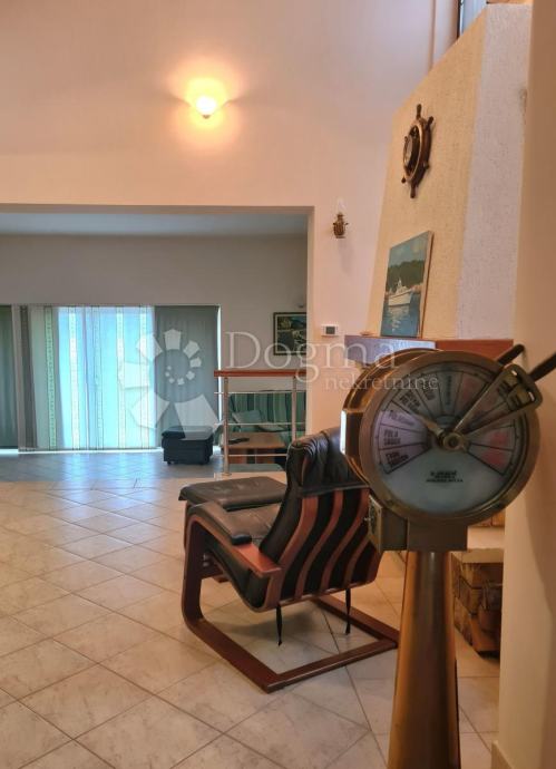Na donjoj etaži nalazi se veliki dnevni prostor koji se sastoji od velikog dnevnog boravka s kaminom spojene blagovaonice i opremljene kuhinje. U donjem dijelu je smještena i jedna kupaona koja može služiti i kao gostinska. Na drugom katu, na koji se penje prekrasnim unutarnjim stepeništem, nalaze se spavaće sobe i ostale kupaone. Stan je lijepo osvjetljen i s balkona se pruža lijepi pogled na more i okolinu.
