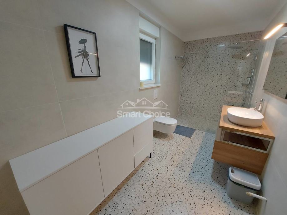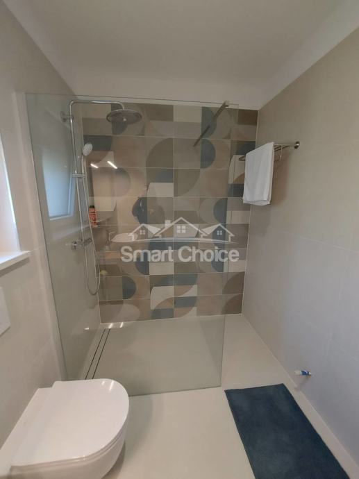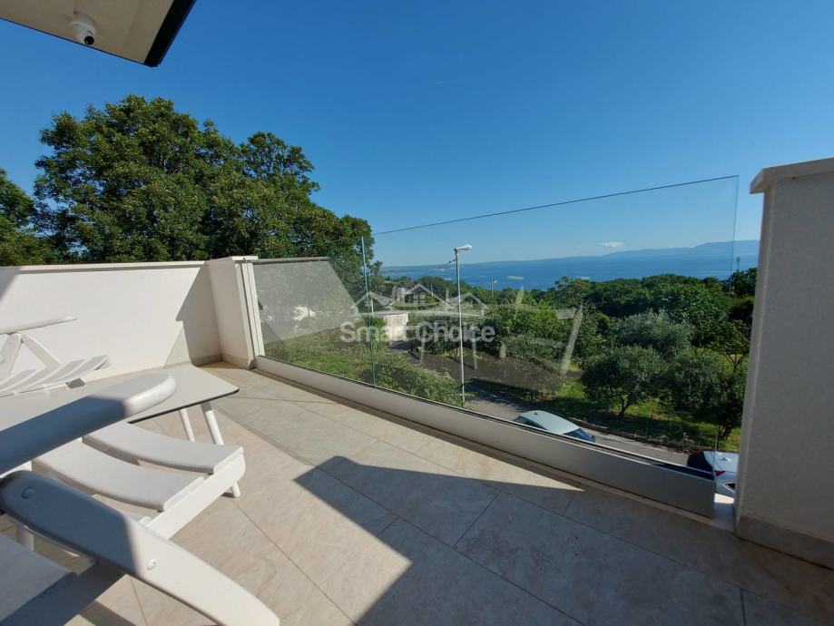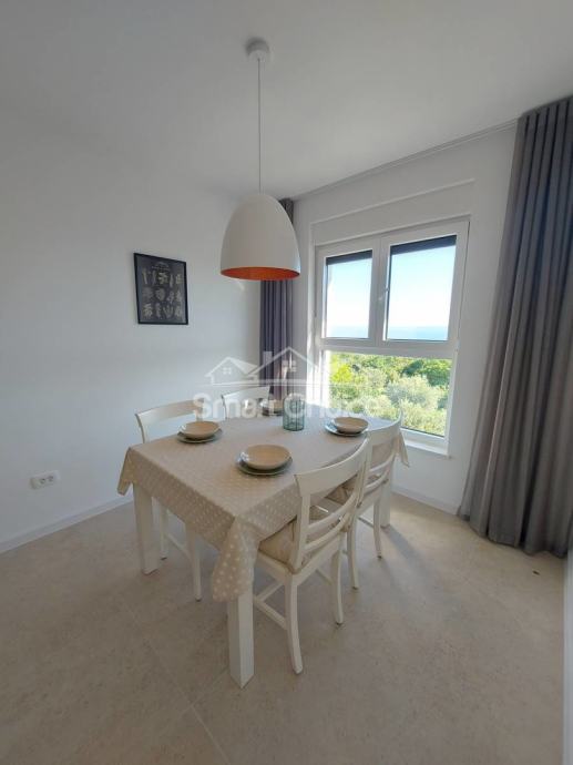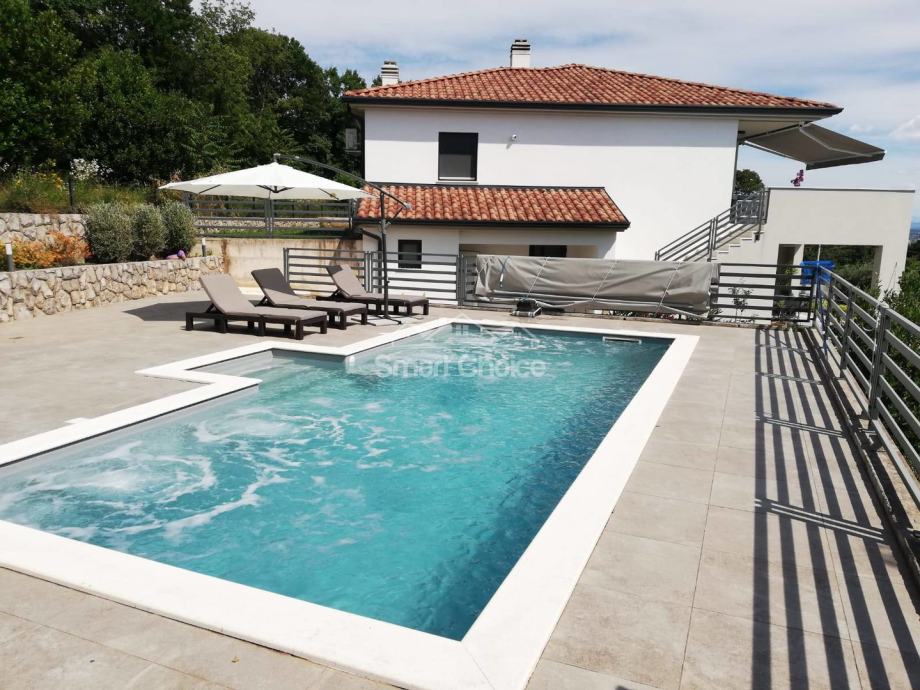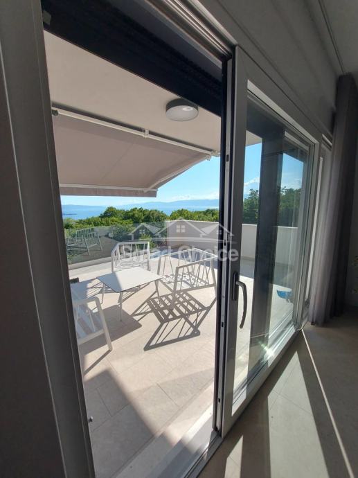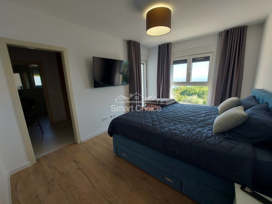 Kostrena - ekskluzivna etaža kompletno novoopremljena i nekorištena u novosagrađenoj vili s bazenom i prekrasnim pogledom na more i zelenilo. Stan ima vlastiti ulaz i sastoji se od velikog dnevnog boravka spojenog s kuhinjom i blagovaonom i izlazom na natkrivenu terasu, 2 sobe od kojih jedna ima walk-in garderobu, vlastitu kupaonicu i balkon, još jedne kupaone i vešeraja. Korištenje bazena je u cijeni najma. Grijanje/hlađenje na klime, wi-fi, parking za više auta. Mirna i tiha lokacija. Stan se iznajmljuje dugoročno. Mogućnost najma garaže. Petra 098429024