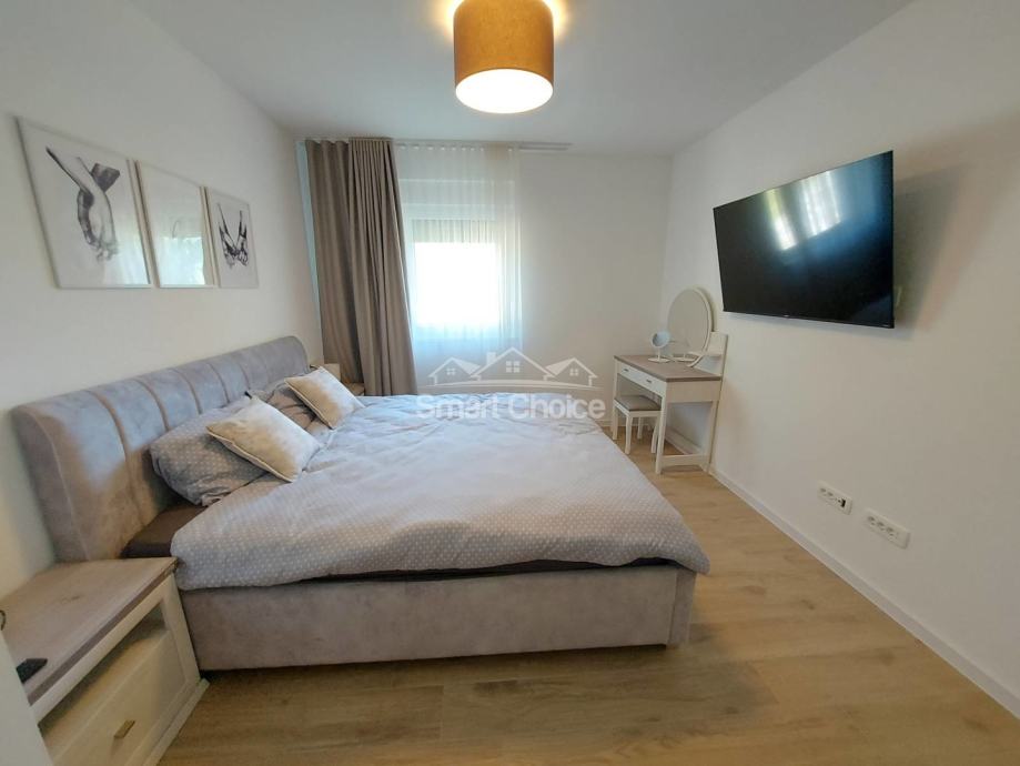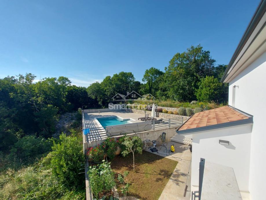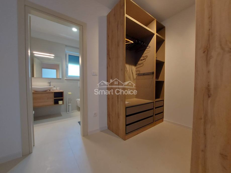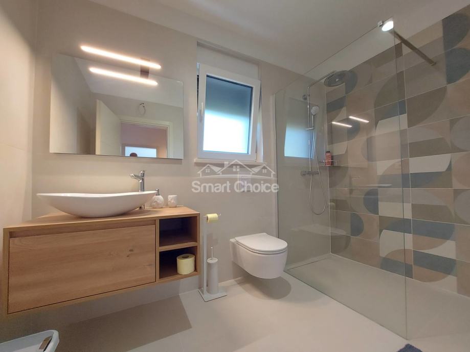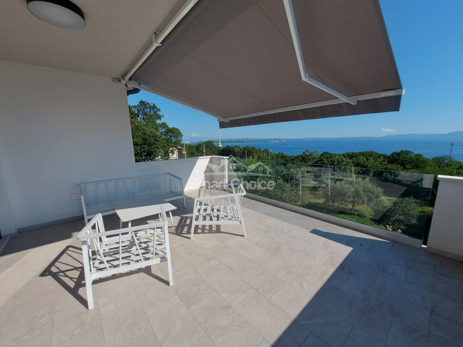 Kostrena - ekskluzivna etaža kompletno novoopremljena i nekorištena u novosagrađenoj vili s bazenom i prekrasnim pogledom na more i zelenilo. Stan ima vlastiti ulaz i sastoji se od velikog dnevnog boravka spojenog s kuhinjom i blagovaonom i izlazom na natkrivenu terasu, 2 sobe od kojih jedna ima walk-in garderobu, vlastitu kupaonicu i balkon, još jedne kupaone i vešeraja. Korištenje bazena je u cijeni najma. Grijanje/hlađenje na klime, wi-fi, parking za više auta. Mirna i tiha lokacija. Stan se iznajmljuje dugoročno. Mogućnost najma garaže. Petra 098429024