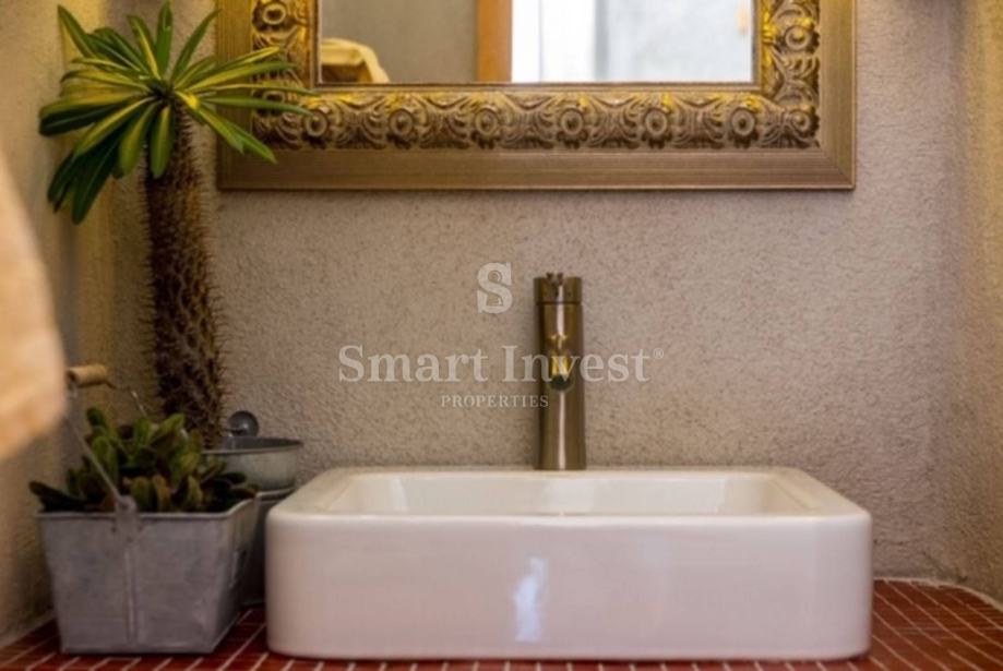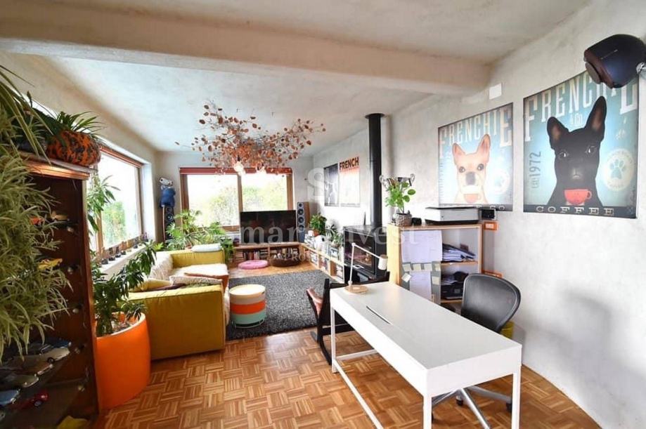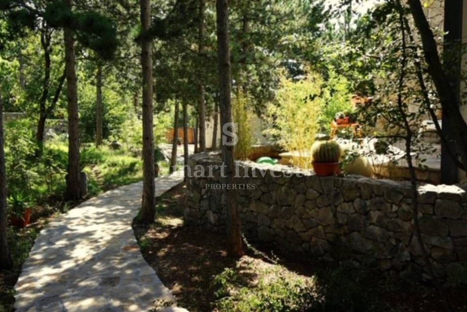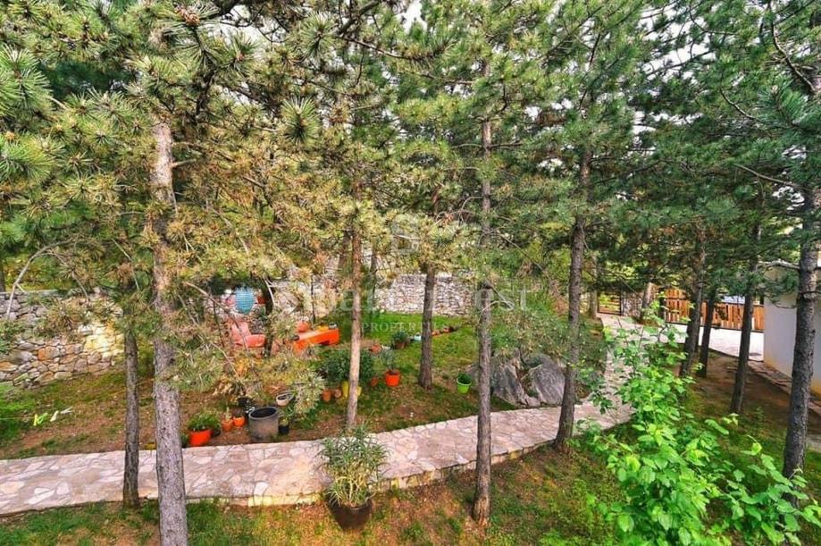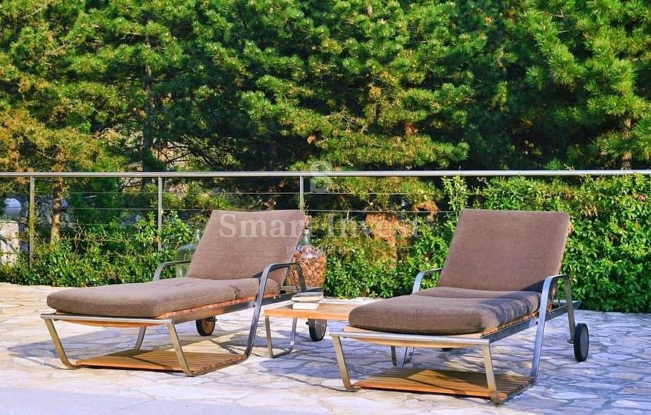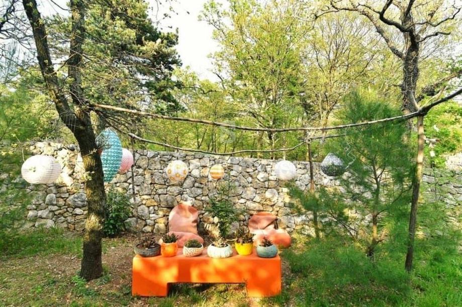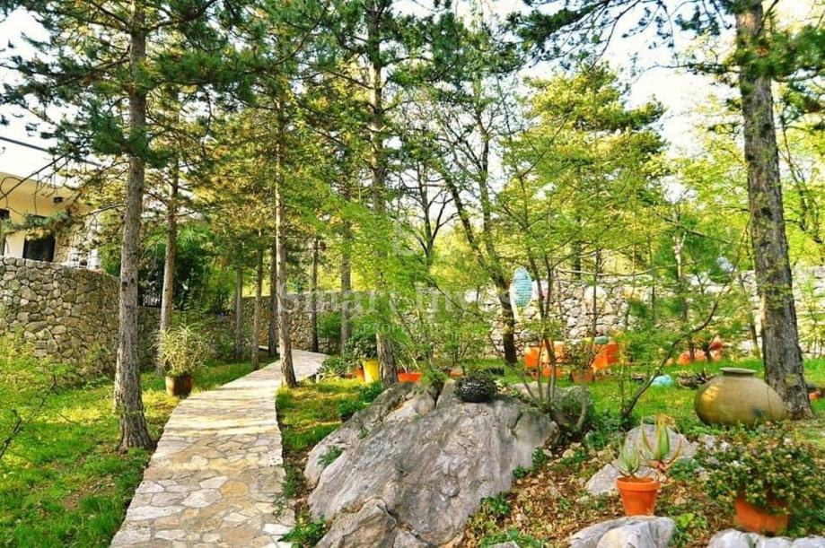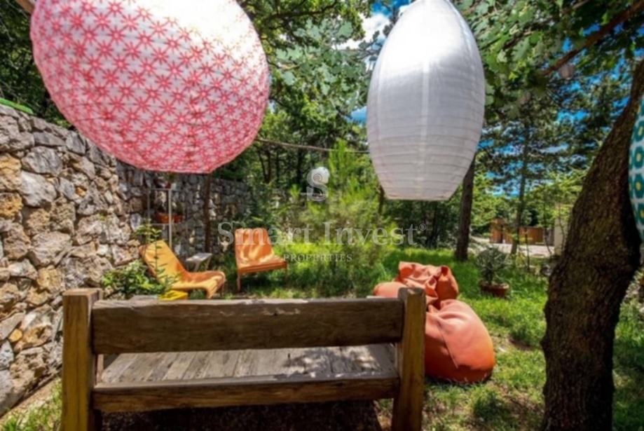 KOSTRENA, zemljište površine 2.200 m2 na kojem se nalaze dva objekta - jedan objekt je površine 60 m2 koji se sastoji od garaže i garsonjere dok drugi objekt ima 120 m2 koji se sastoji od 2-sobnog stana s terasom i bazenom.