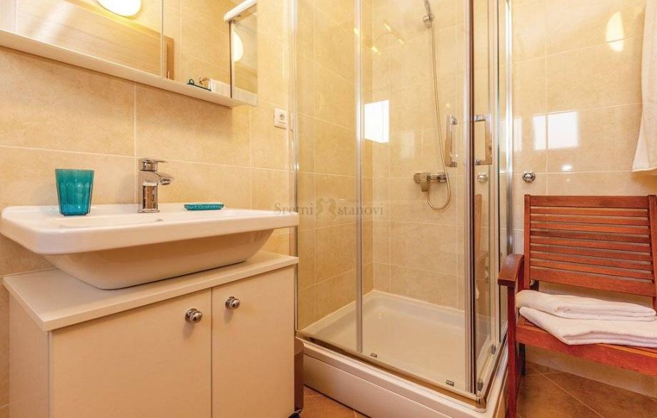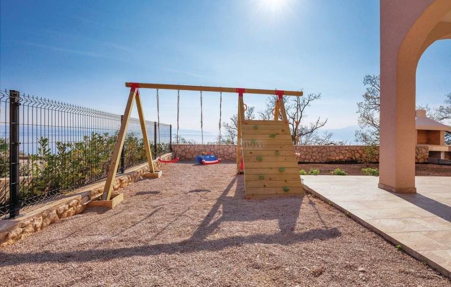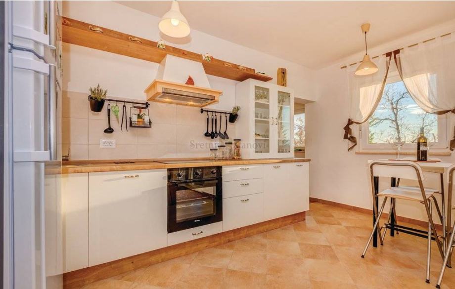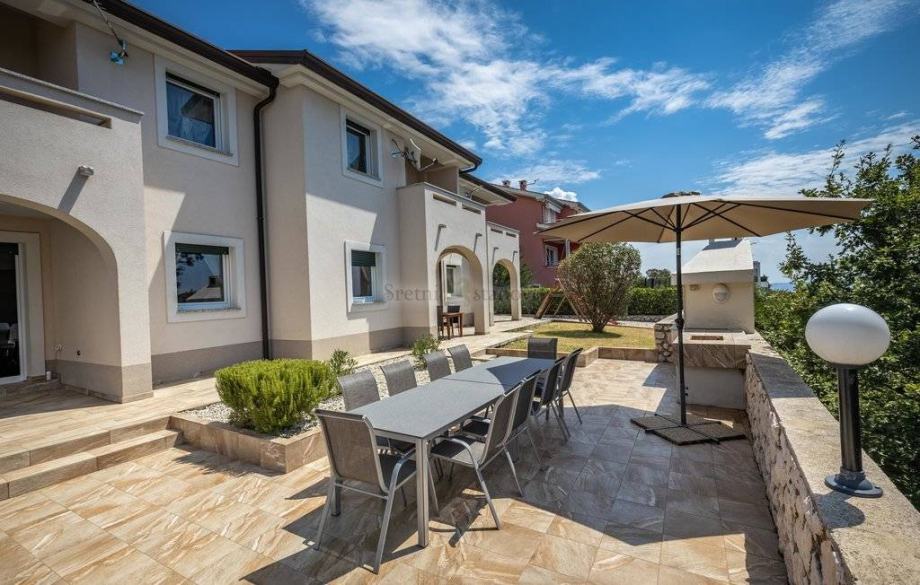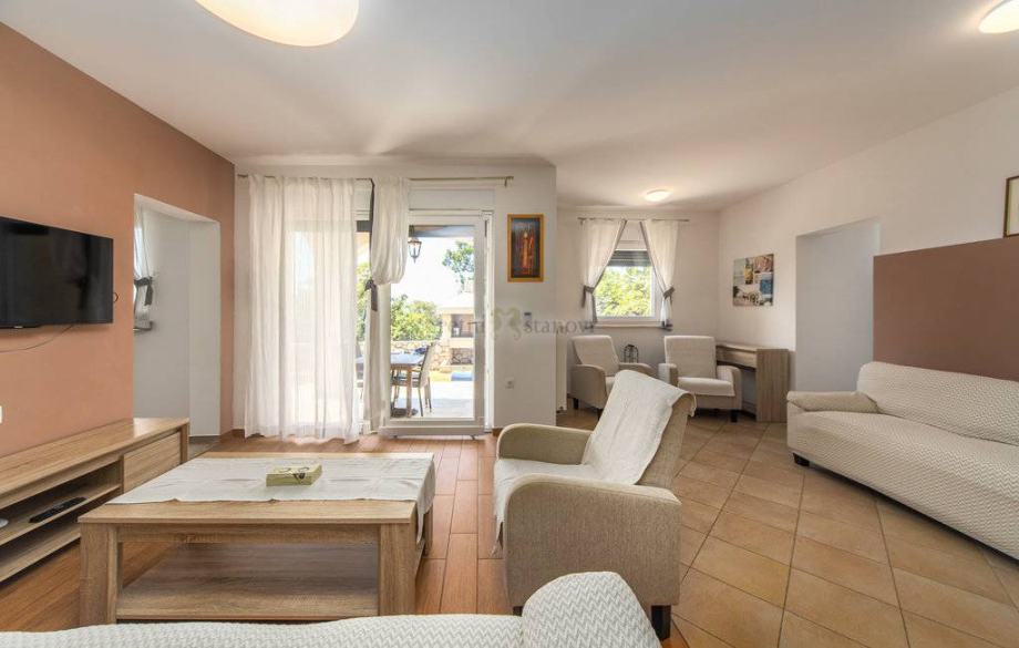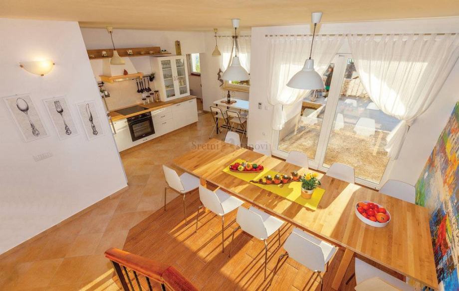 Samostojeća kuća s bazenom i prekrasnim pogledom na more i okolicu. Sastoji se od dnevnog boravka, , kuhinje, blagovaone, pet spavaćih soba, tri kupaone i tri Wc-a, sobe za biljar, prostora za rekreaciju, balkona i terase. U okućnici je lijepi bazen i roštilj te prostor za zabavu za djecu. Grijanje je centralno etažno na plin i klima uređaje. U kući su svi aparati i perillice,Tv, posuđe, mikrovalna pećnica i slično. Parkirnih mjesta je više nego dovoljno (6). Kuća se iznajmljuje digoročno.