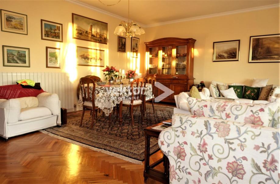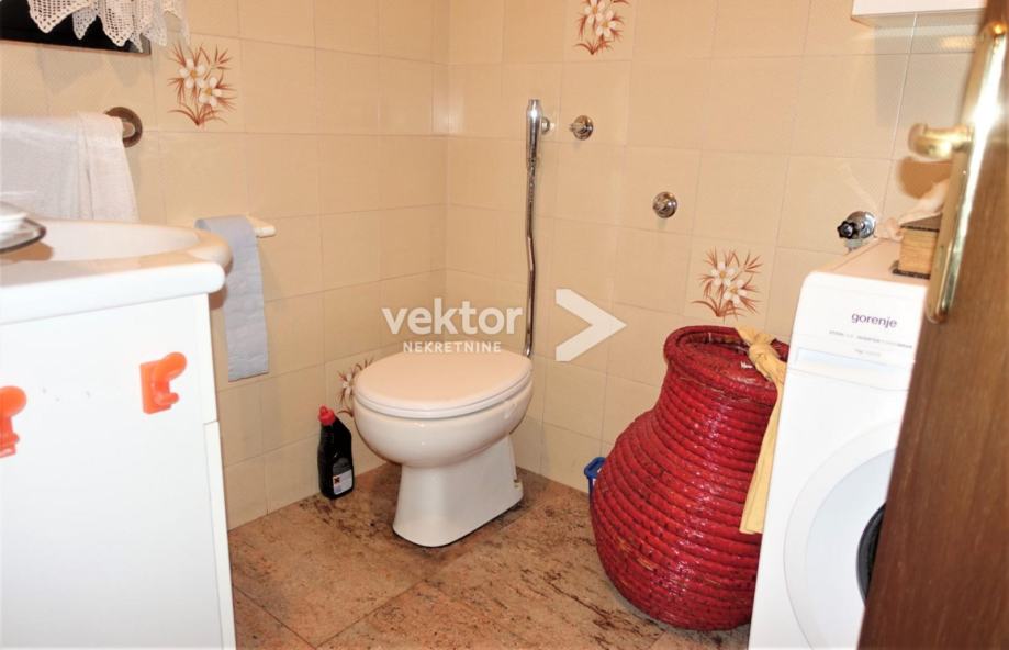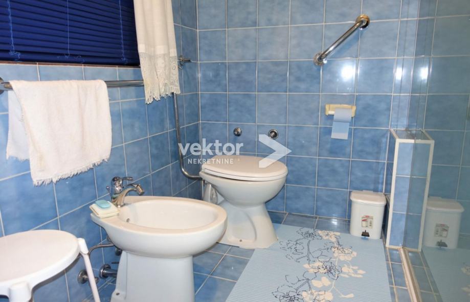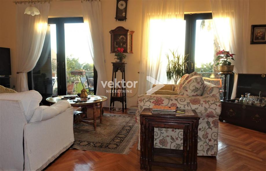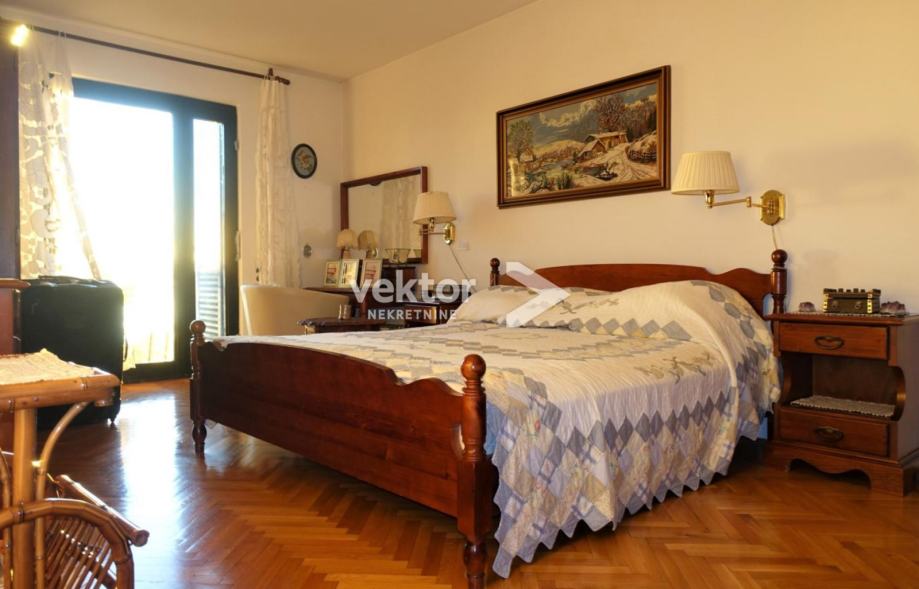 U kući su dva stana i garaža od 19m2. U suterenu je prostrana soba, komotna kupaona i veliki dnevni boravak iz kojeg se izlazi na popločenu terasu ispred koje je vrt prepun zelenila. Prizemlje i 1. kat je dvoetažni stan, u prizemlju je dnevni boravak sa izlazom na južnu prostranu terasu, kuhinja i kupaonica. Unutarnje stubište povezuje prizemlje i kat na kojem se nalaze tri spavaće sobe i kupaona, svaka soba ima svoj balkon i pogled na more.