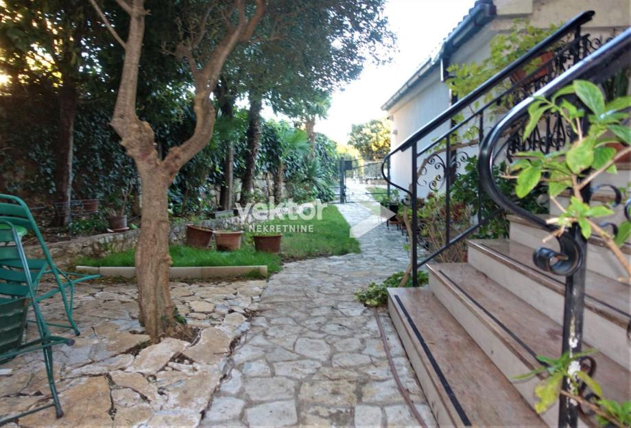 Iako je riječ o dvojnoj kući (jednim manjim dijelom se drži za susjednu kuću) nekretnina ima apsolutnu privatnost. Definirana okućnica od 387m2 ispunjena je mediteranskim zelenilom i palmama i osigurava intimu.