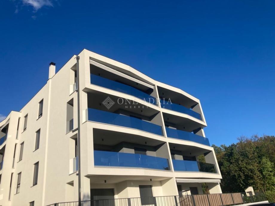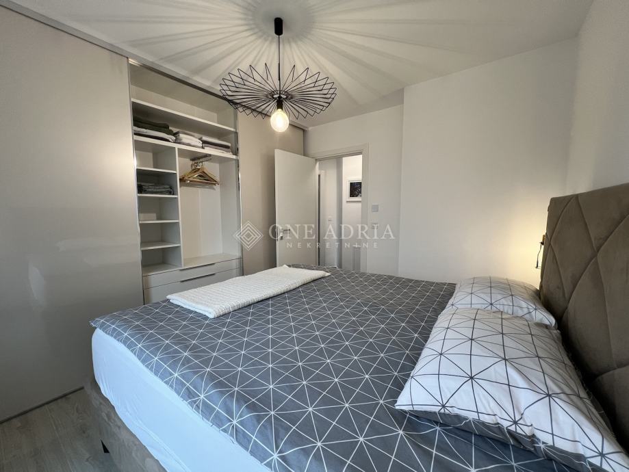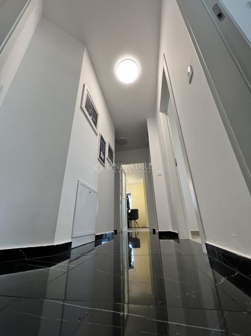 Sastoji se od ulaznog hodnika, dvije spavaće sobe, kupaonice, odvojenog toaleta te prostranog open space dnevnog prostora koji obuhvaća kuhinju s blagovaonicom i dnevni boravak s izlazom na veliku terasu s koje se pruža lijep pogled na more.