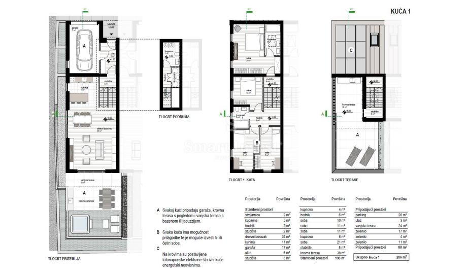 KUĆA 1 – ukupne površine 286 m2 (površina stambenog prostora 198 m2), sastoji se od podruma, prizemlja i kata.