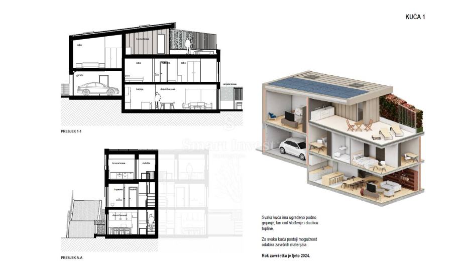 Kuće su opremljene vlastitom solarnom elektranom koja pokriva sve energetske potrebe, uključujući dizalice topline, grijanje bazena i druge male potrošače, omogućavajući značajne uštede na računima!