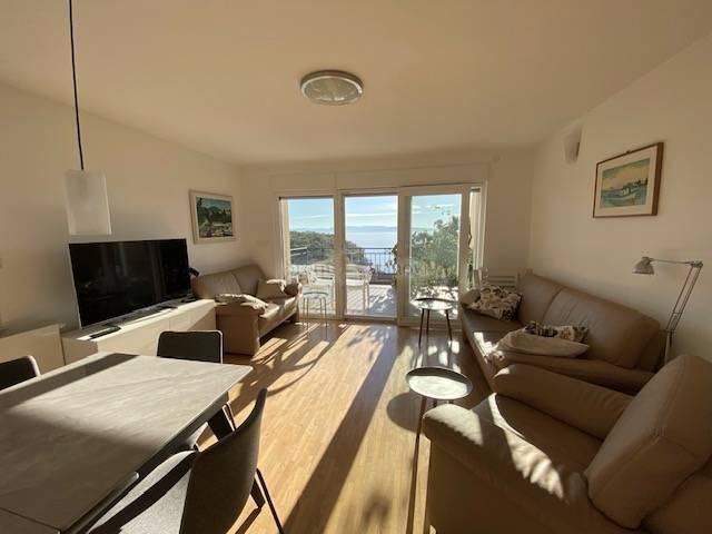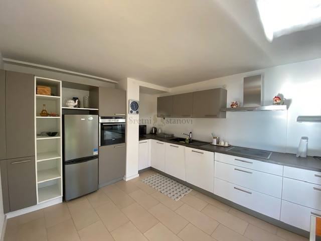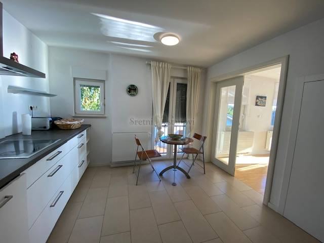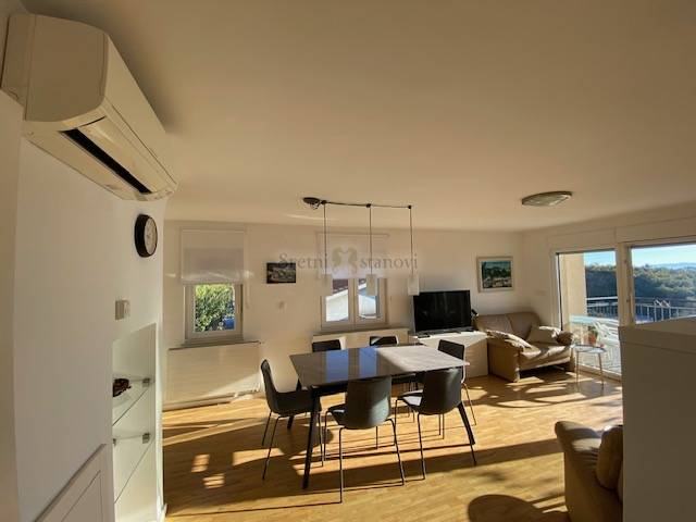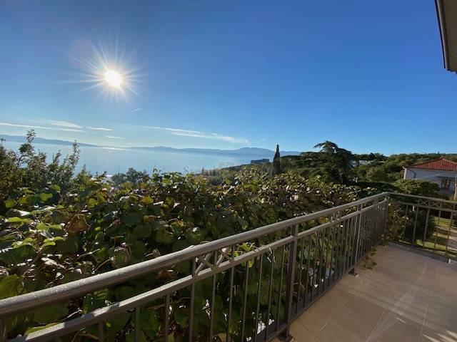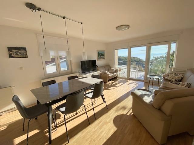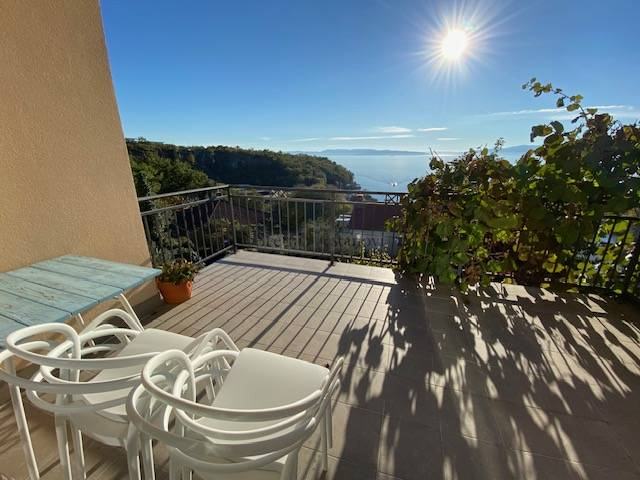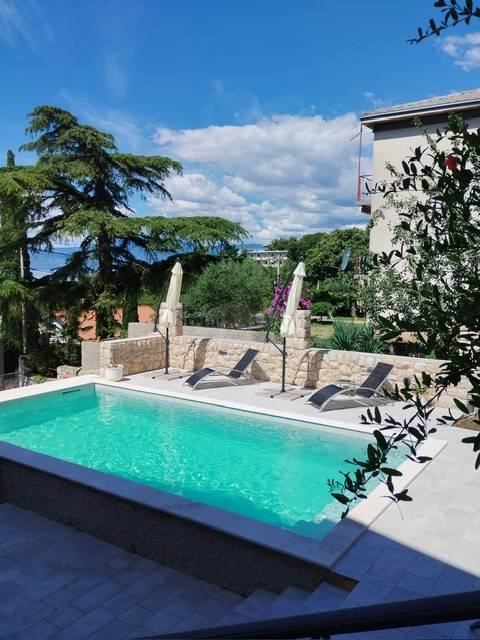 Na prekrasnoj lokaciji u Kostreni, blizina plaža i šetnice, iznajmljuje se stan na drugom katu kuće s odvojenim ulazom. Stan se sastoji od prelijepe terase s očaravajućim pogledom i maksimalnom intimom, dnevnog boravka prepunog svjetlosti, jedaćeg dijela, velike kuhinje s blagovaonom, tri spavaće sobe s izlazom na balkon, a ujedno treća soba služi i kao radna prema izboru, dvije kupaone, utility rooma i predsoblja. Također, u okućnici je i veliki bazen sa sunčalištem. Stan je namješten, opremljen je svim aparatima i perilicama. Grijanje je centralno na plin i klimatizacija. Internet je aktivan. Garažno mjesto je jedno, plus jedno vanjsko. Režije se plaćaju odvojeno. Izvrsna lokacija blizu mora i plaža.
