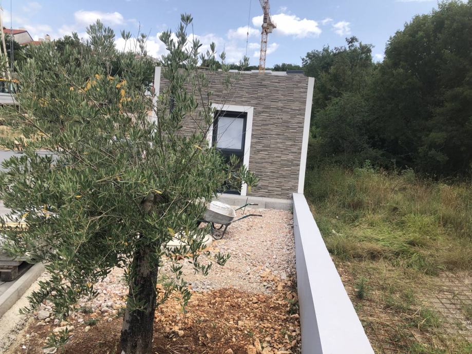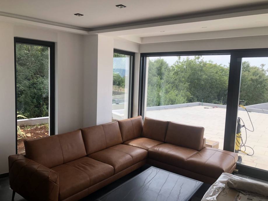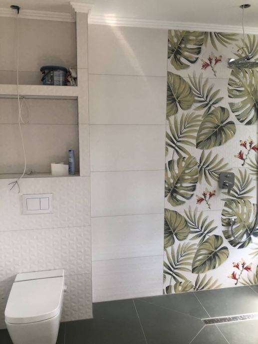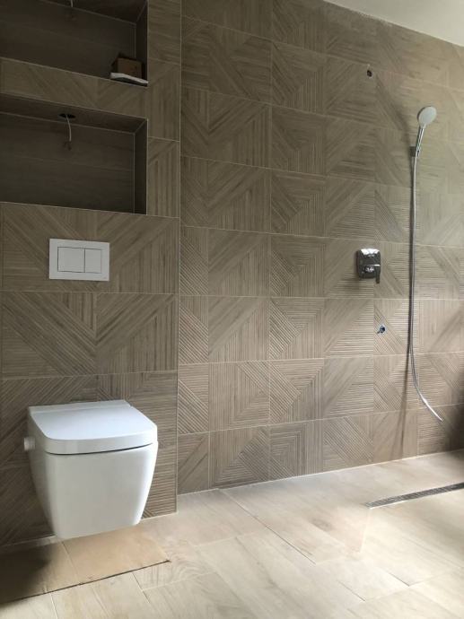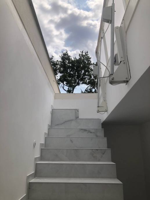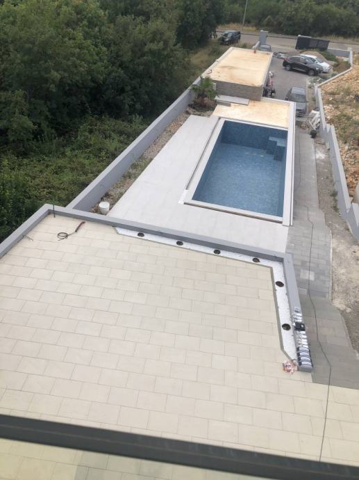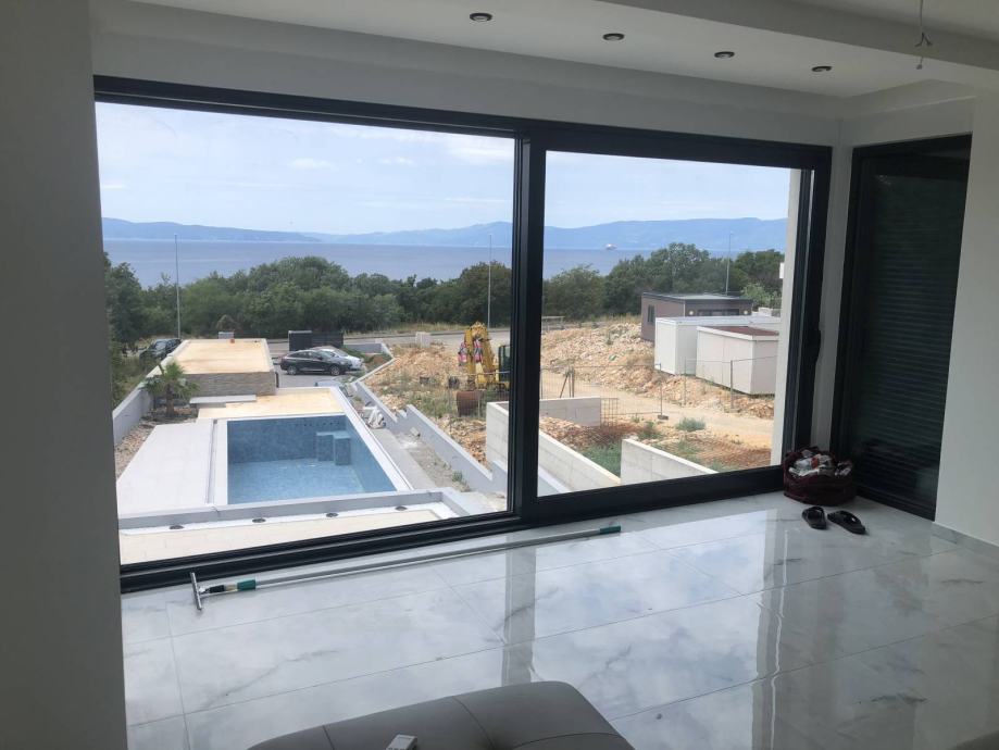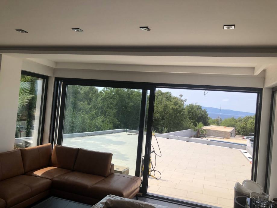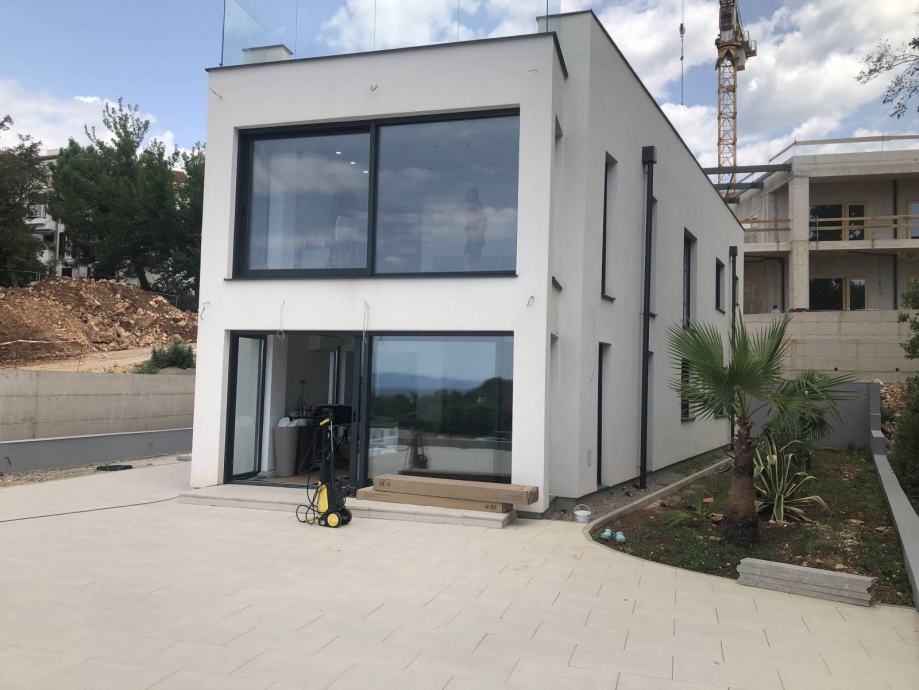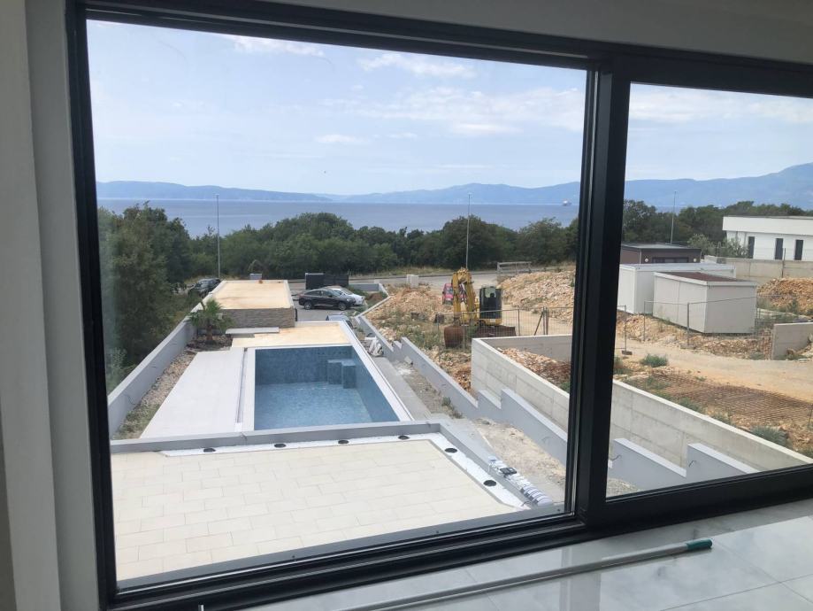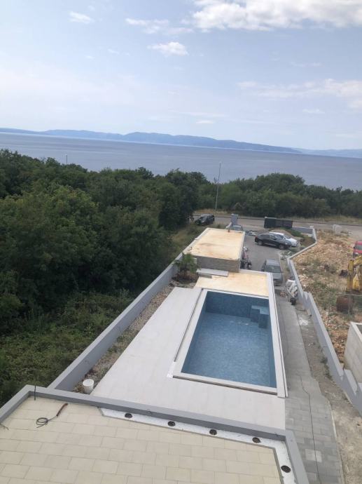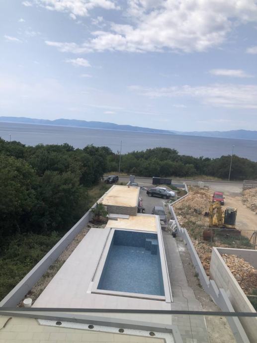 Luksuzna kuća novogradnja s pomoćnom kućom u Kostreni, (prvi najam i korištenje) na svega 50ak metara od mora, u prvom redu i sa predivnim pogledom na more. Kuća se sastoji od dva stana, svaki površine 84m2 i krovne terase. Stan u prizemlju ima 2 spavaće sobe a onaj na katu ih ima 3 , od kojih po jedna na svakom katu ima privatnu kupaonu. Svaki stan ima po 2 kupaone i wc. Ispred kuće je velika okućnica na kojoj su smjšteni terasa sa ljetnom kuhinjom, bazen sa sunčalištem te pomoćna kuća površine 35m2 u kojoj je relax zona, sobica za poslugu i kupaona. Kuća ima 4 parkirna mjesta u svojoj ograđenoj okućnici sa vratima na daljinsko upravljanje. Grijanje je podno, a hlađenje na klima uređaje u čitavoj kući. Bazen je grijani površine 45 m2 (1000x450). Kuća je izgrađena na parceli površine 1060 m2. Režije se plaćaju posebno prema stvarnoj potrošnji. (slike su snimane u početnoj fazi namještanja interijera i uređenja okoliša i bazena).