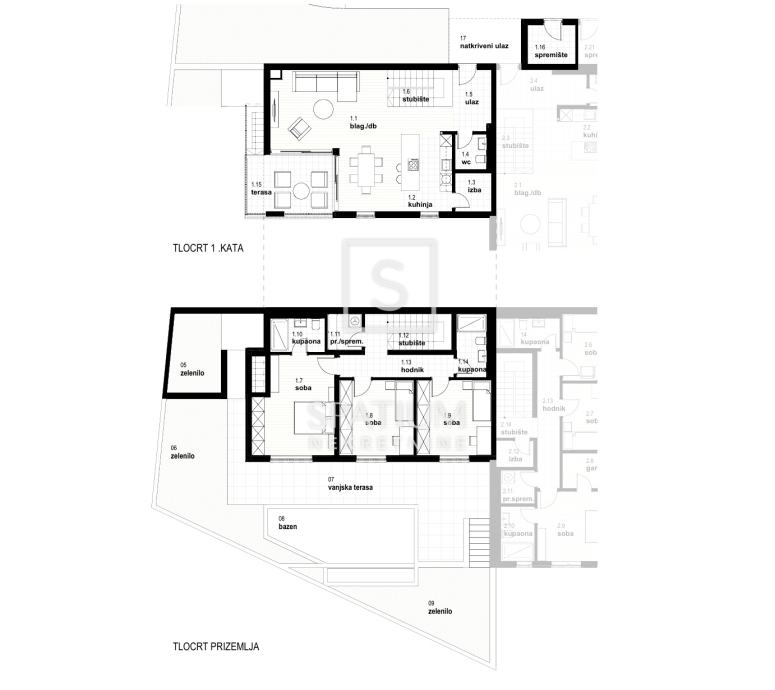 - dvije kupaonice, toaleta, vešeraja, hodnika, ulaza i spremišta
