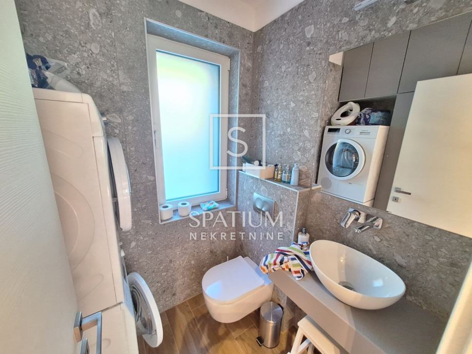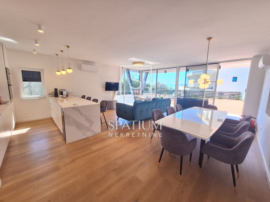 KOSTRENA, u ponudi imamo prostran stan od 110M2 koji se sastoji od kuhinje sa blagovaonom i dnevnim boravkom, četiri spavaće sobe, dvije kupaone, toaleta, hodnika te prostrane terase. Pripada mu spremište te jedno vanjsko i jedno garažno parkirno mjesto. Podovi su kroz cijeli stan obloženi kvalitetnim hrastovim troslojnim parketom ispod kojeg je postavljeno podno grijanje. Svaka soba ima termostat za regulaciju grijanja i klima uređaj. Stan se prodaje potpuno namješten i opremljen svim potrebnim aparatima kojih je dio u garanciji.. Nalazi se svega stotinjak metara do plaže.