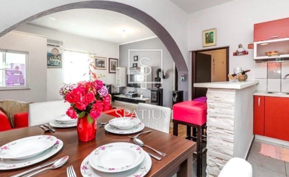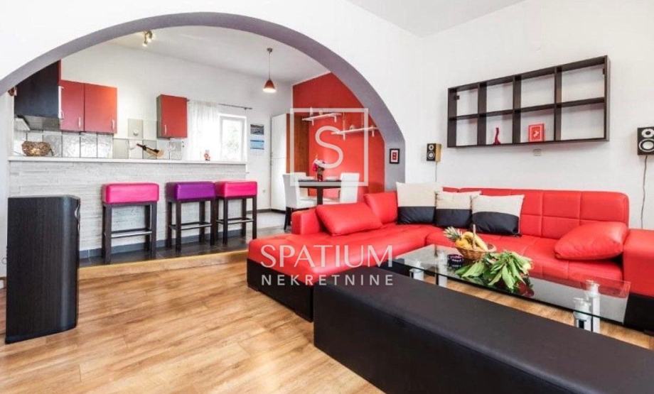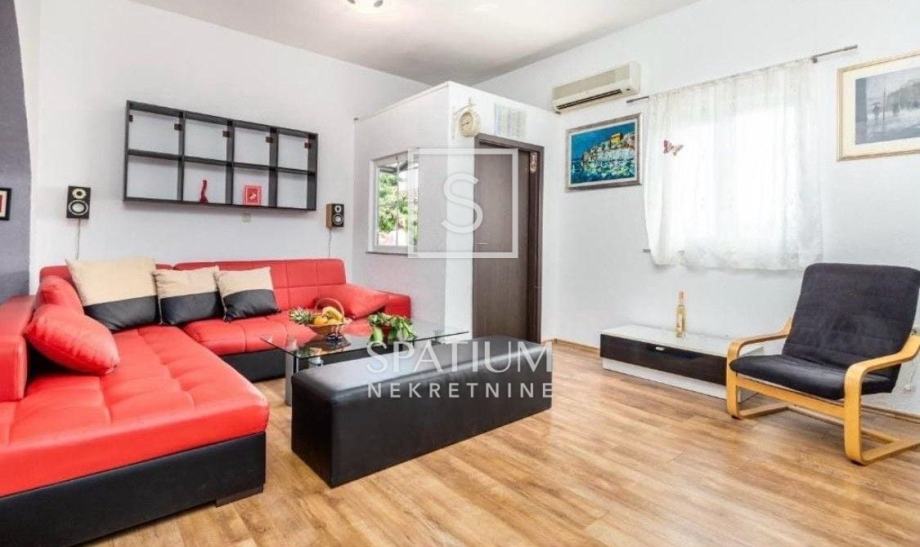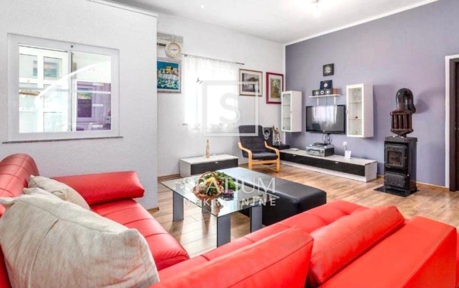 KOSTRENA, u ponudi je stan površine 90m2 za dugoročni najam. Sastoji se od jedne spavaće sobe, kuhinje, dnevnog boravka i kupaone. Smješten je u prizemlju obiteljske kuće, te ima zaseban ulaz s vlastitom terasom i vrtom.