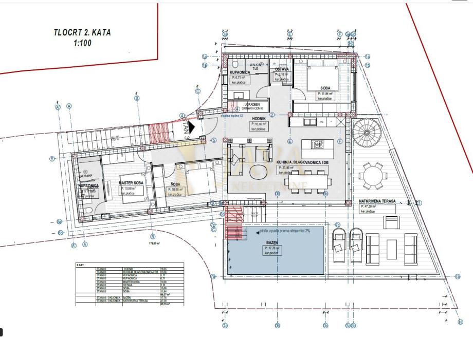* Sastoji se od: blagovaonice i dnevnog boravaka, kuhinje, ostave, kupaonice i tri prostrane sobe, uključujući master spavaću sobu s vlastitom kupaonicom