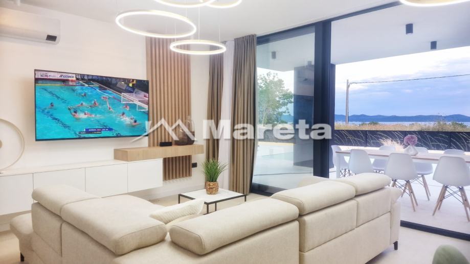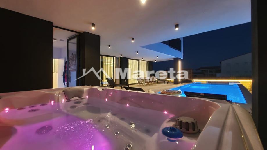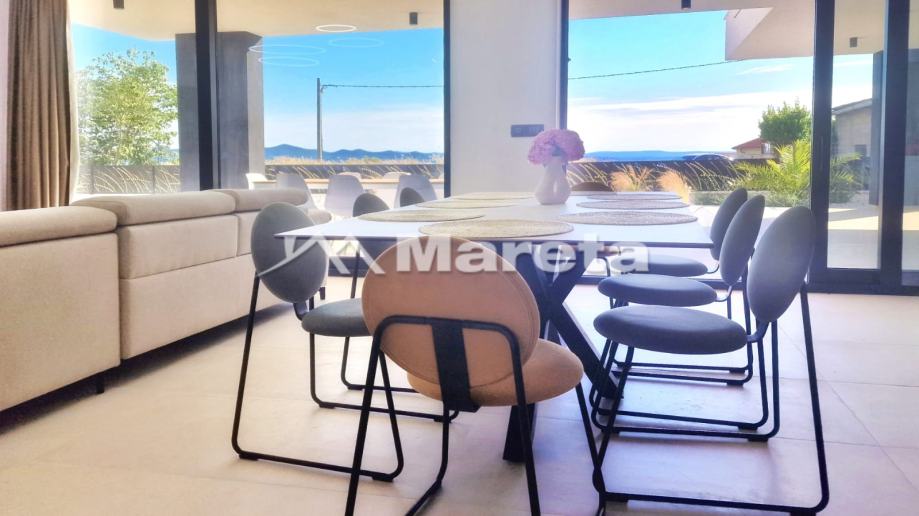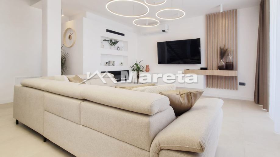 U prizemlju se nalazi prostrani dnevni boravak s kuhinjom i blagavaonicom iz koje se izlazi na terasu s bazenom. Iza kuhinje je gostinjski wc i sauna .Do kata se dolazi s visećim stepenicama. A na katu su tri spavaće sobe gdje svaka soba ima kupaonicu s wc-om.