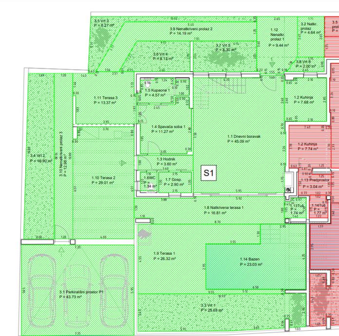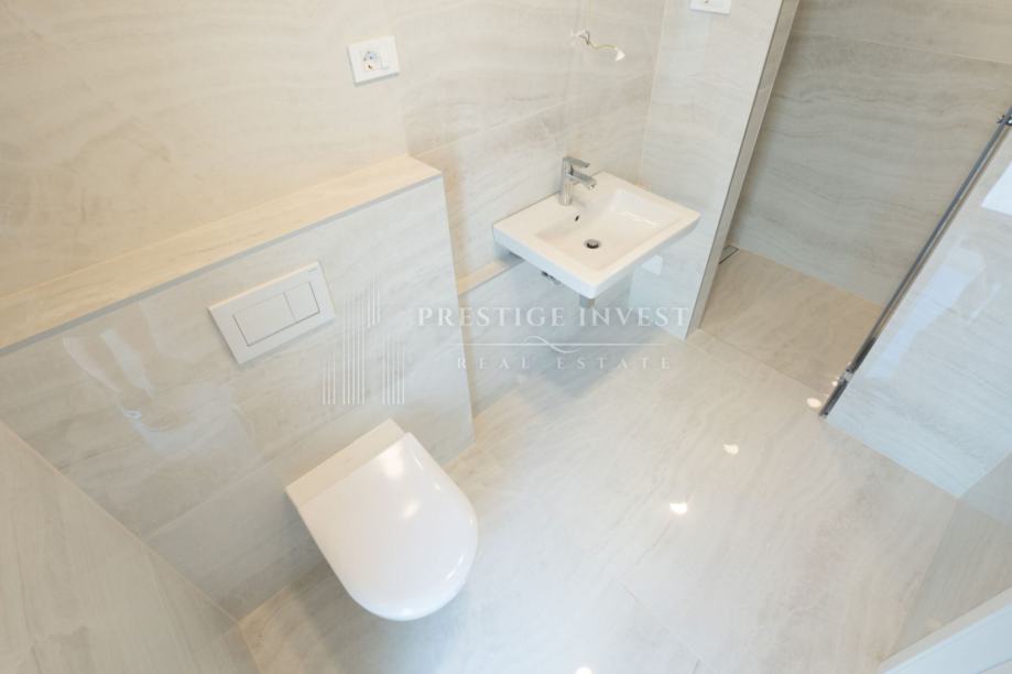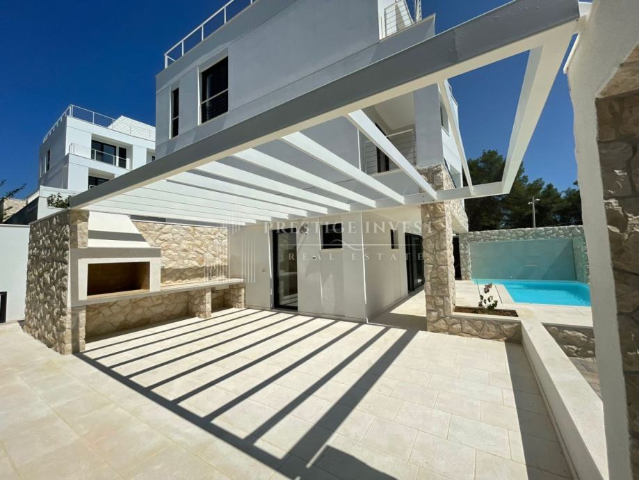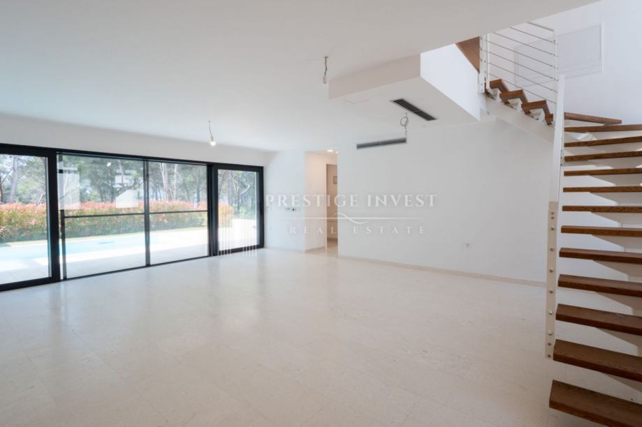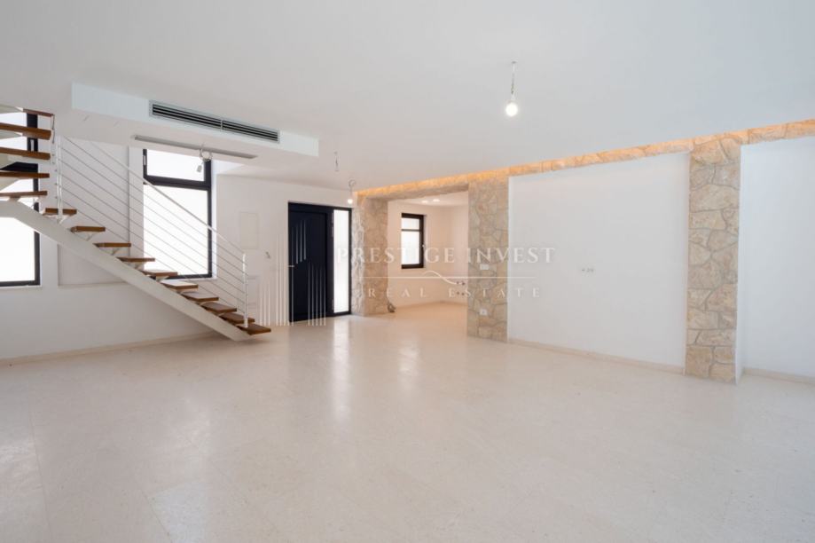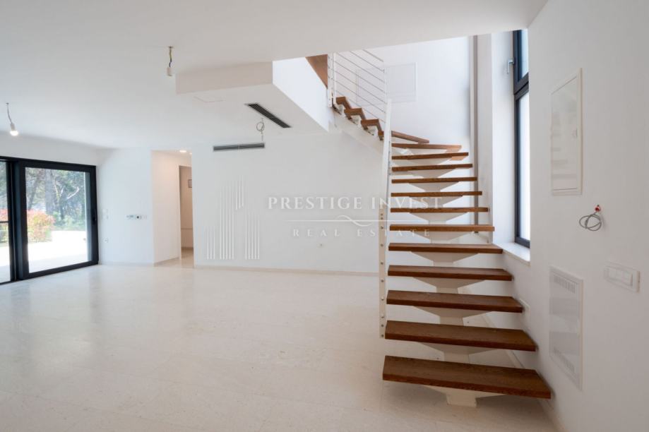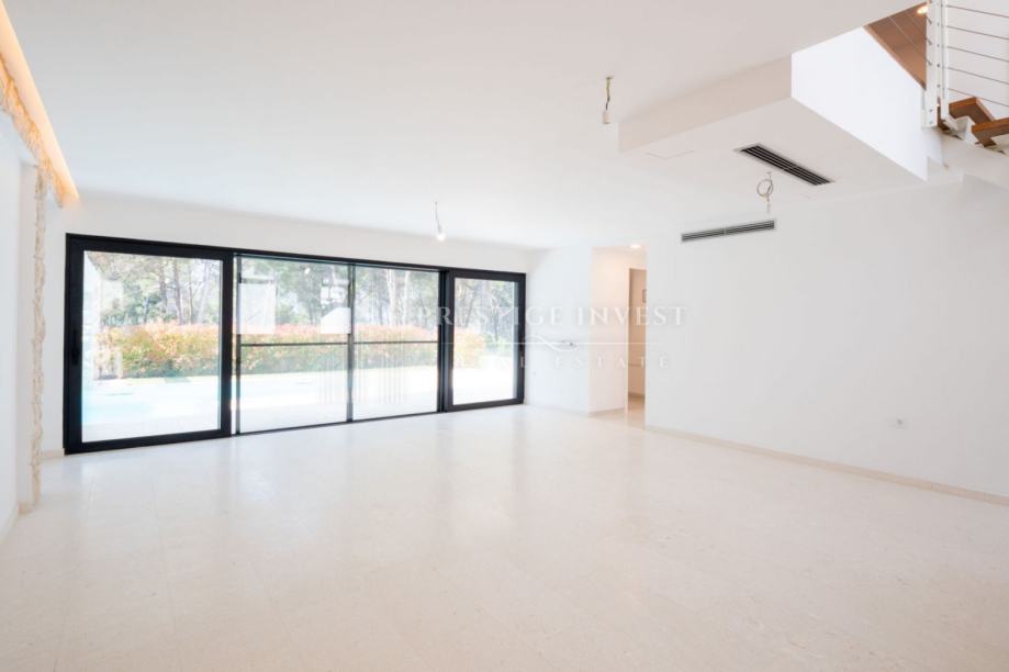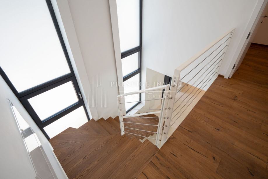 Posredujemo u prodaji stana u stambenoj zgradi s ukupno tri stambene jedinice. Stan ima brutto površinu od 417m2, te 222 netto stamebene površine. Stan je dvoetažan i prostire se na dvije etaže, prizemlje i prvi kat. Na prvom katu nalazi se veliki zajednički dnevni boravak s kuhinjom, ostava, wc i prva spavaća soba s zasebnom kupaonicom i vlastitom terasom. Veliki HS portal povezuje dnevnu zonu sa parcelom sa dva sjedeća prostora, sa ljetnom kuhinjom sa roštiljem i sudoperom. Iz dnevnog boravka iz prizemlja izlazi se na vrt s bazenom koji ima vlastitu filtracijom i pripremom za ostale sadržaje (protustruju, jet, grijanje toplinskom pumpom). Kvalitetna DerFall folija za bazen.