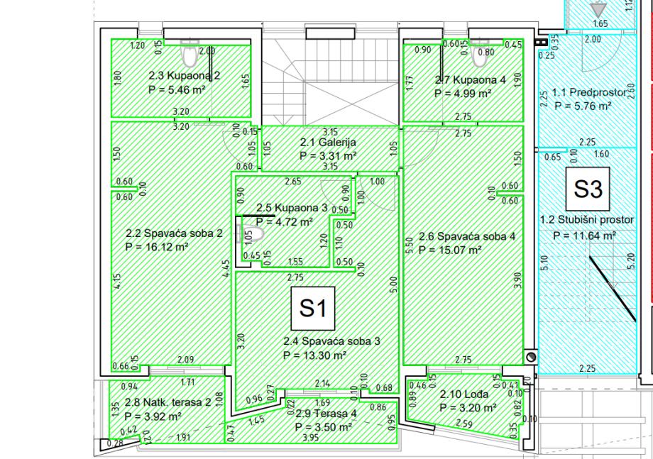 Na gornjem katu nalaze se tri spavaće sobe do kojih se dolazi preko unutarnjeg stubišta iz dnevnog boravka. Spavaće sobe su veličine 16m2,15m2 i 13m2.